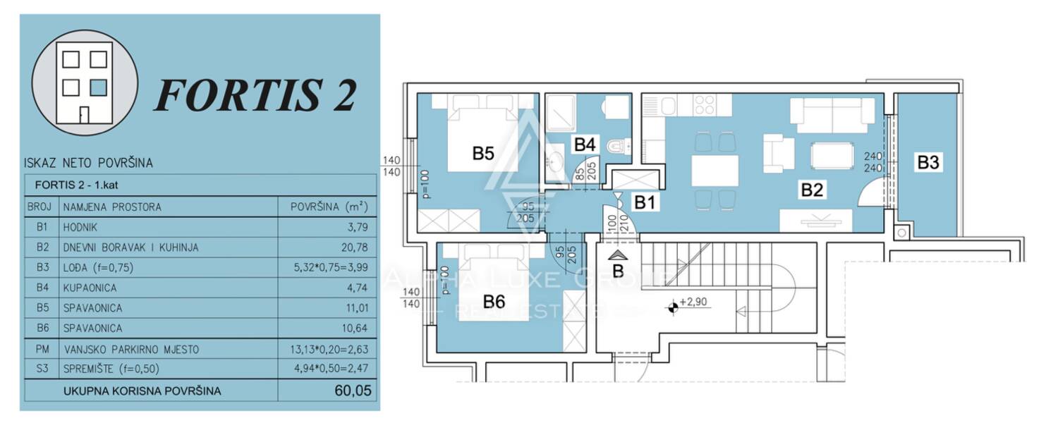 Ovaj kvalitetno osmišljen stan nalazi se na prvom katu moderne stambene zgrade te nudi ukupnu neto površinu od 60,05 m², uključujući lođu, vanjsko parkirno mjesto i privatno spremište.