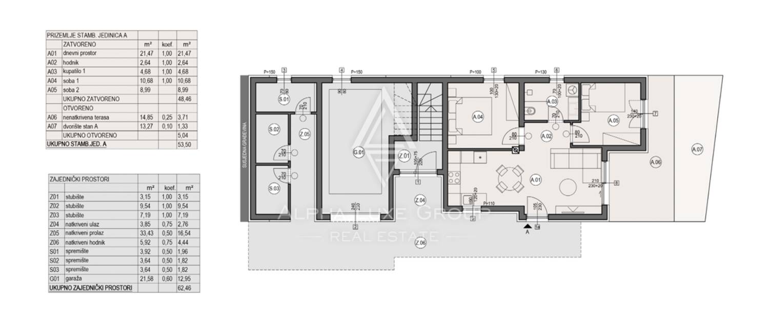 Stan se nalazi u prizemlju i ima funkcionalan raspored koji uključuje open space dnevni boravak s kuhinjom i blagovaonicom, dvije spavaće sobe, kupaonicu, nenatkrivenu terasu i vlastiti vrt, čime se postiže savršen spoj unutarnjeg komfora i boravka na otvorenom.