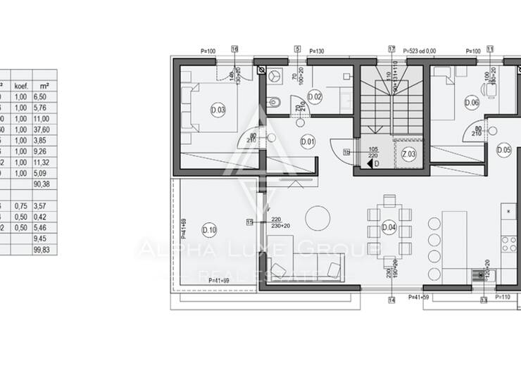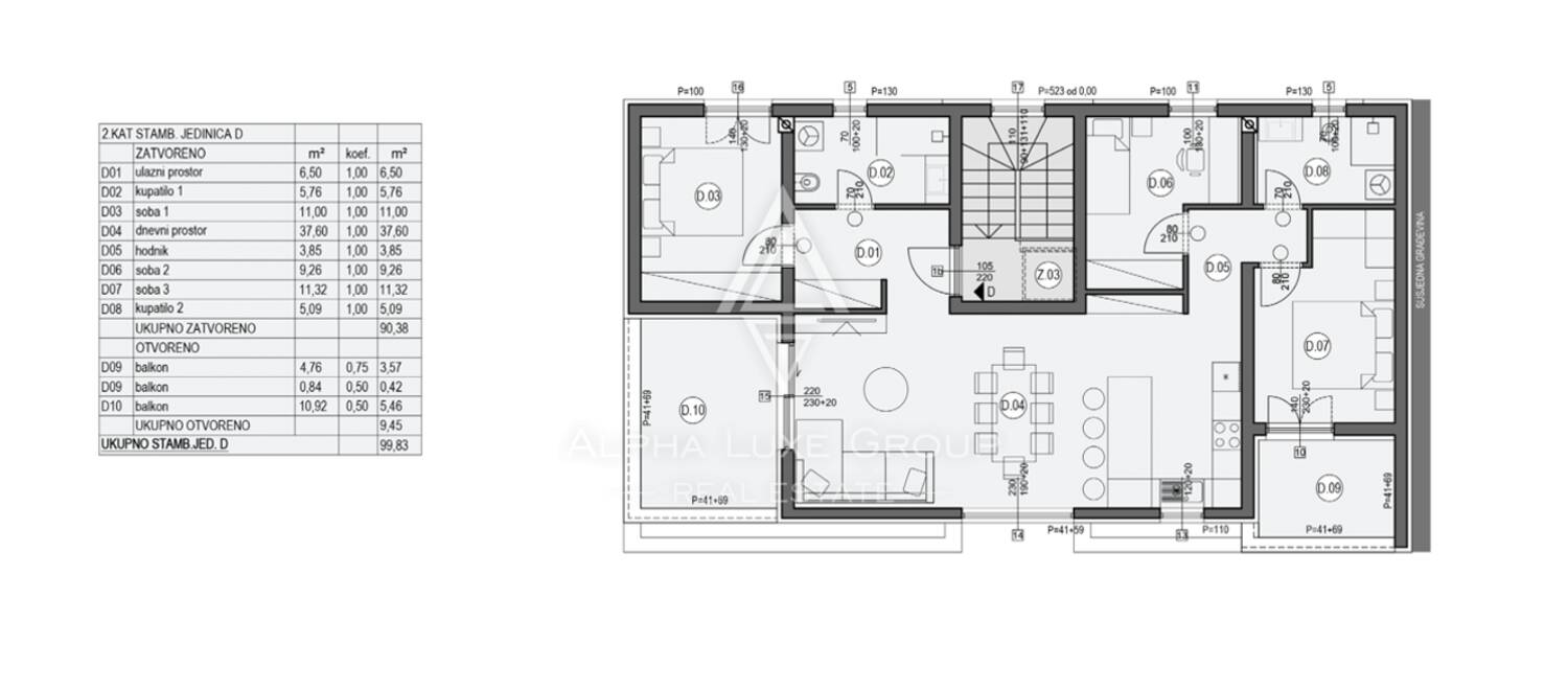 Stan se nalazi u jednoj od zgrada i ima pažljivo osmišljen raspored koji spaja funkcionalnost i udobnost. Sastoji se od ulaznog prostora, svijetlog open space dnevnog boravka povezanog s kuhinjom i blagovaonicom, tri udobne spavaće sobe, garderobe, hodnika, dvije moderne kupaonice te dva balkona koji dodatno obogaćuju životni prostor.