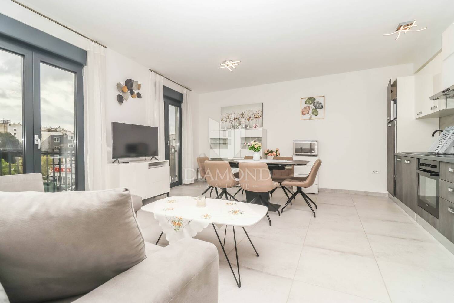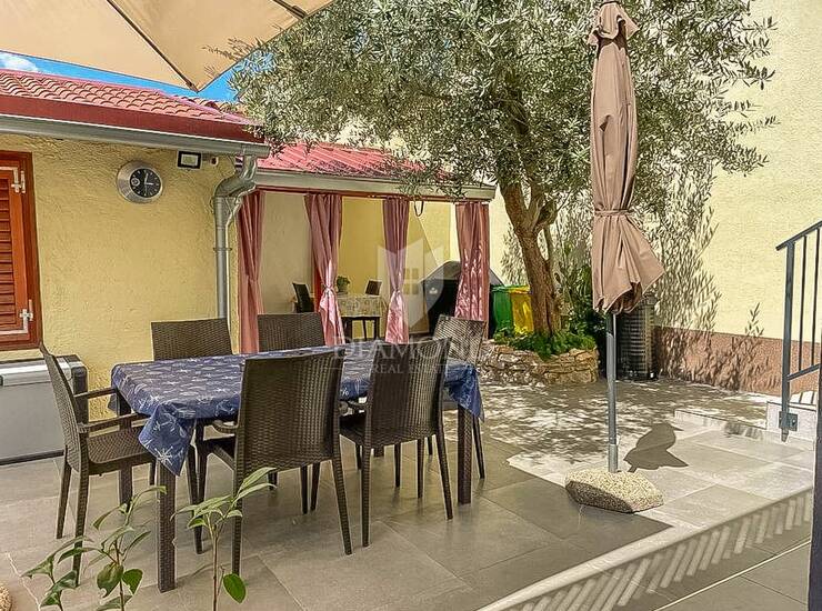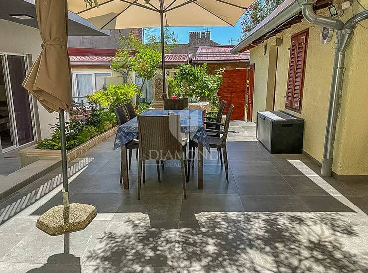 Riječ je o novoizgrađenoj kući visoke kvalitete gradnje, koja se prostire na tri etaže i sadrži tri zasebna, moderno opremljena stana. Objekt ima i garažu koja se prostire na 50 m2 s dva parkirna mjesta. U prostoru garaže nalazi se tehnička prostorija s dizalicom topline, vešeraj te dodatni toalet. Iz garaže, kao i s glavnog ulaza, pristupa se unutarnjem stubištu koje vodi prema stambenim jedinicama. U prizemlju se nalazi prvi stan veličine 55 m2 a koji obuhvaća prostrani dnevni dio s kuhinjom i blagovaonicom, dvije spavaće sobe (jedna s izlazom u dvorište) te moderno uređenu kupaonicu s walk-in tušem i podnim grijanjem. Na prvom katu nalazi se stan s gotovo identičnim rasporedom, kvadrature 56 m2 uz dodatak balkona s pogledom na vrt, dok se na drugom katu nalazi simpatičan stan u potkrovlju koji uključuje dnevni boravak, kuhinju, blagovaonicu, jednu spavaću sobu, kupaonicu i krovnu terasu idealnu za opuštanje. Stan