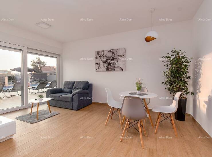 prizemlje-dnevni boravak i kuhinja, izlaz na bazen, kupatilo, a na drugoj etaži je spavaća soba sa velikom terasom.