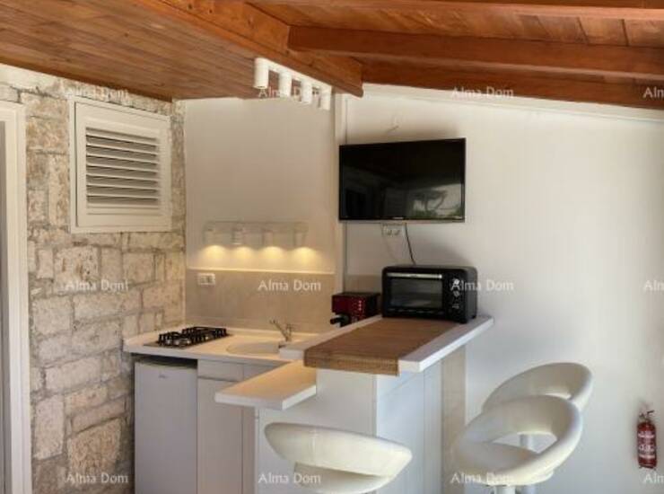 Kuća se sastoji od dvije etaže + suterena. Na prvom katu nalazi se prostrani stan od 98,7 m² s velikim zapadno orijentiranim balkonom (12 m²), dvije spavaće sobe, dnevnim boravkom, kuhinjom, blagovaonicom i kupaonicom. Stan obiluje dnevnim svjetlom i okružen je pogledom na borovu šumu i mediteransko zelenilo.