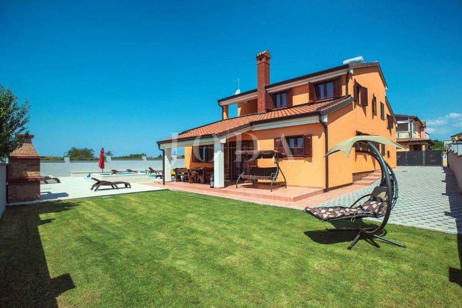 Na uređenoj okućnici nalazi se bazen sa sunčalištem, jacuzzi, velika natkrivena terasa, roštilj i stolni tenis.