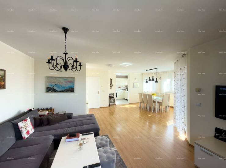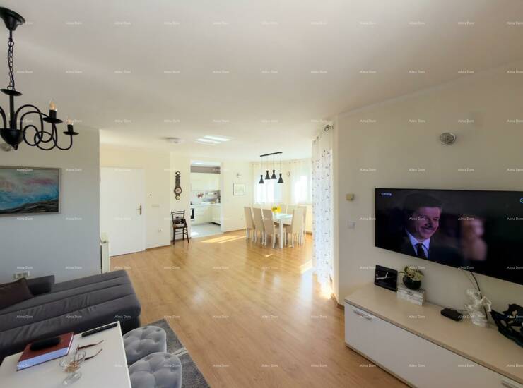 Veći stan se sastoji od kupatila, ostave, kuhinja, blagovaonice i dnevnog boravka iz kog se izlazi na natkrivenu terasu i vrt u kom je bazen i roštilj.