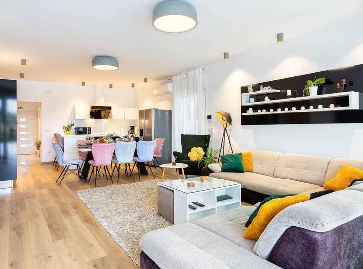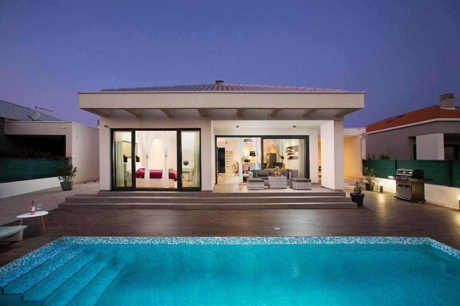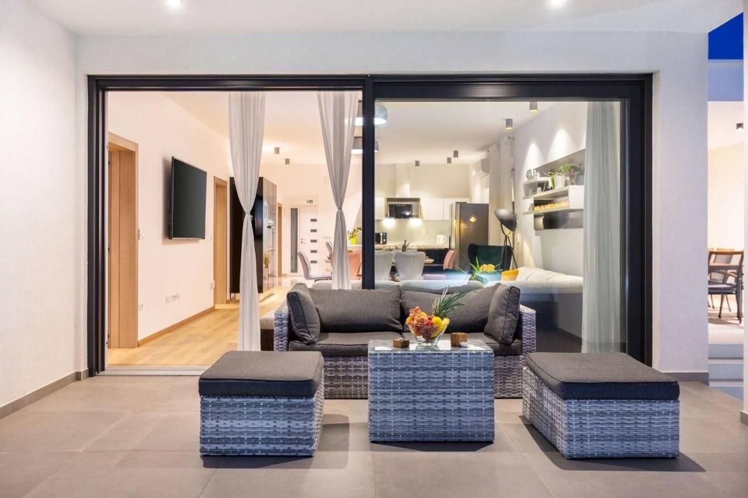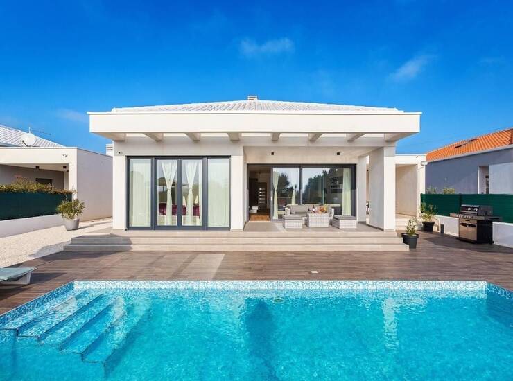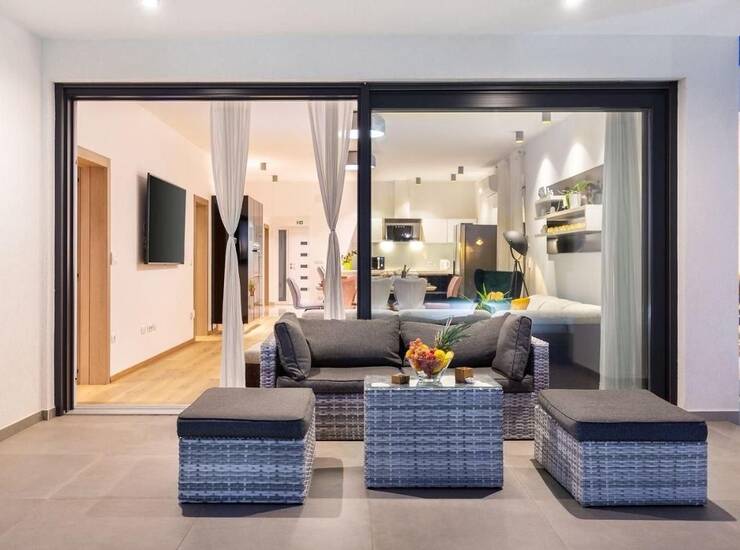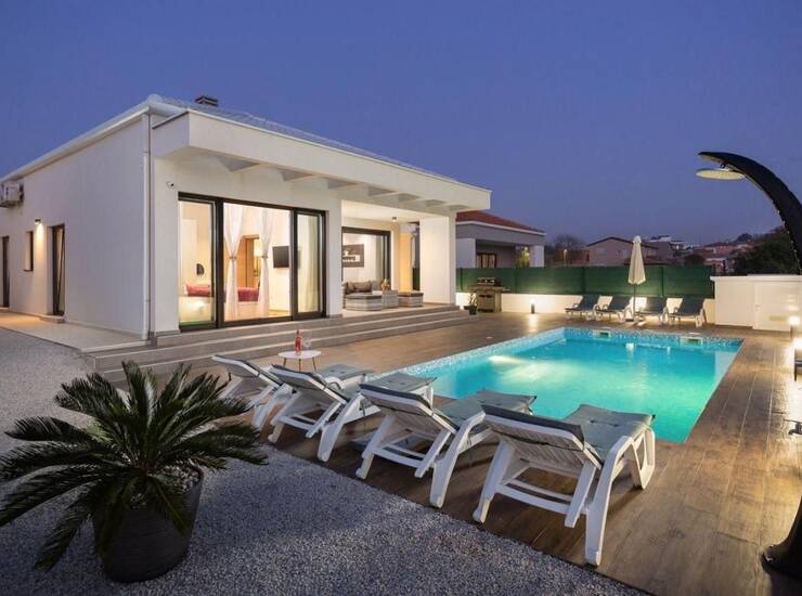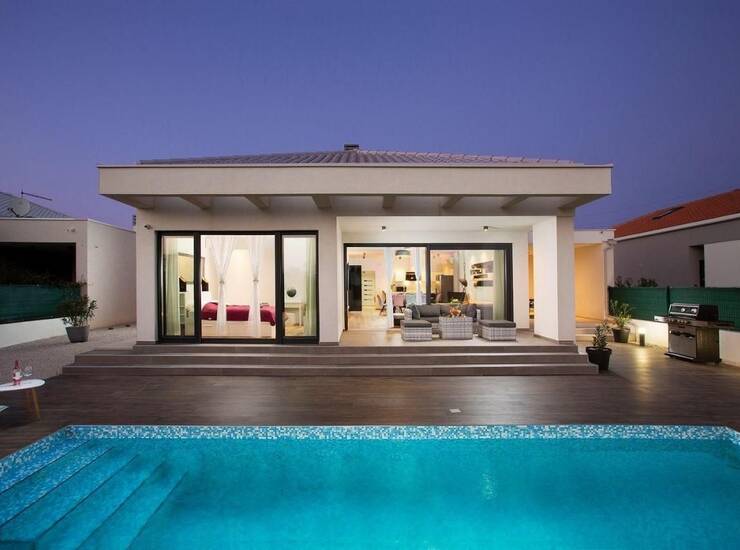 Moderna prizemnica ukupne površine od 215 m2 stambenoga prostora sastoji se od ulaznog hodnika, open space prostorije u kojoj su se savršeno uklopili moderna i opremljena kuhinja s blagovaonom i osunčani dnevni boravak idealan za druženje s obitelji i prijateljima iz kojega se pruža direktan izlaz na vanjsku natkrivenu terasu sa sjedećom garniturom.