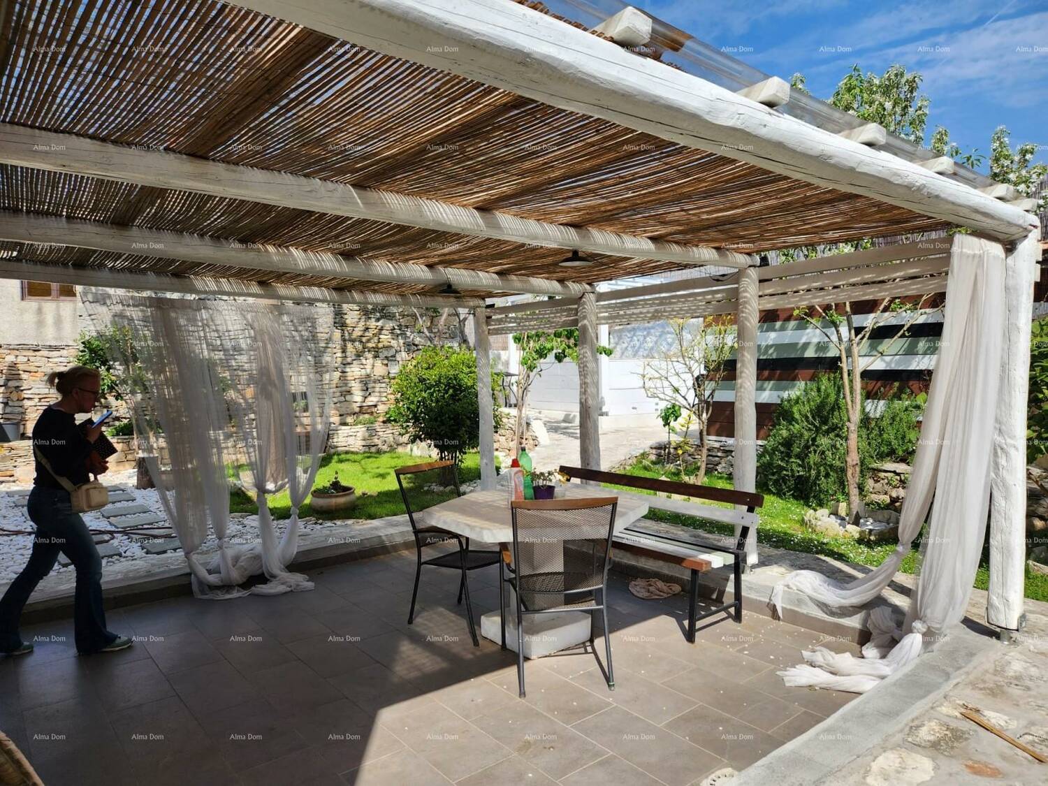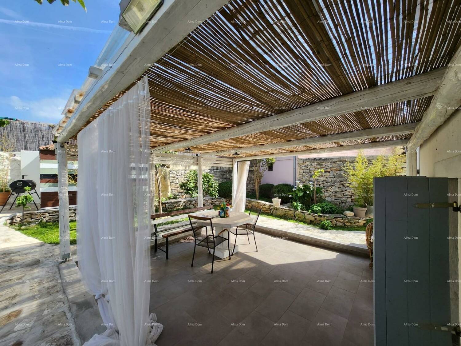 Dvorište površine 231 m² opremljeno je voćkama, roštiljem, solarnim tušem, natkrivenim montažnim bazenom, ostavom/alatnicom te vanjskim pristupom za bicikle i motocikle. Nova, popločena i natkrivena terasa (25 m²) pruža privatnost i udobnost.