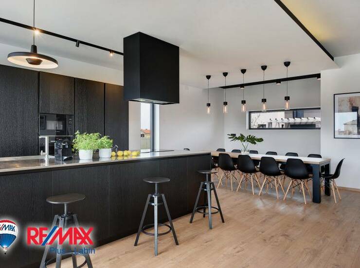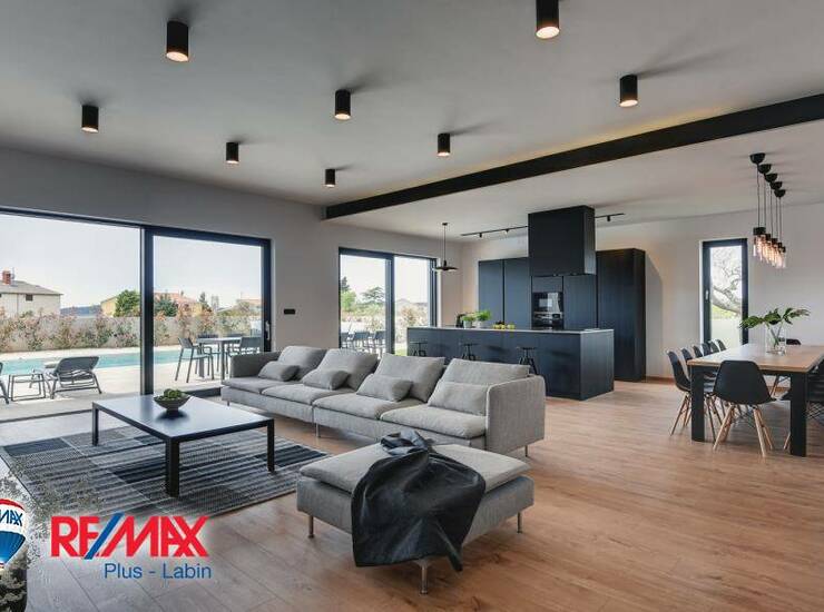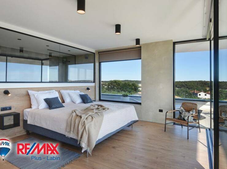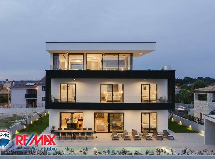 Novoizgrađena moderna vila sastoji se od 7 spavaćih soba od kojih svaka ima svoju kupaonicu, velikog otvorenog prostora u kojem se nalazi kuhinja s blagovaonicom i dnevni boravak iz kojeg se izlazi na vanjsku terasu, WC-a i spremišta.