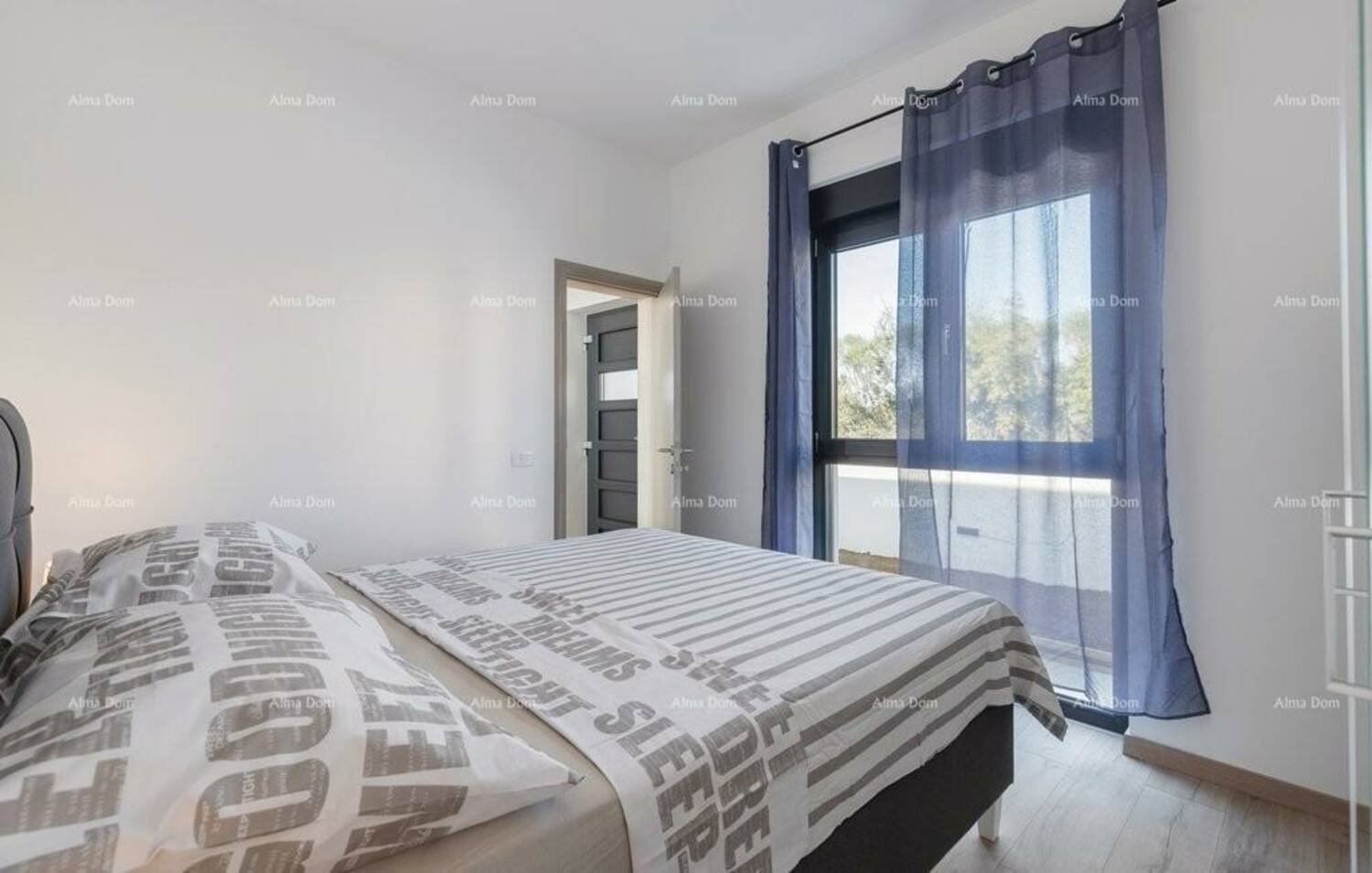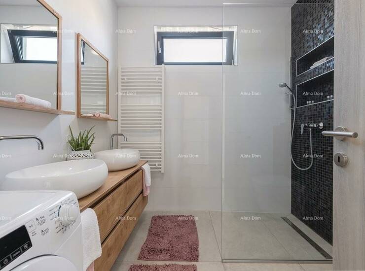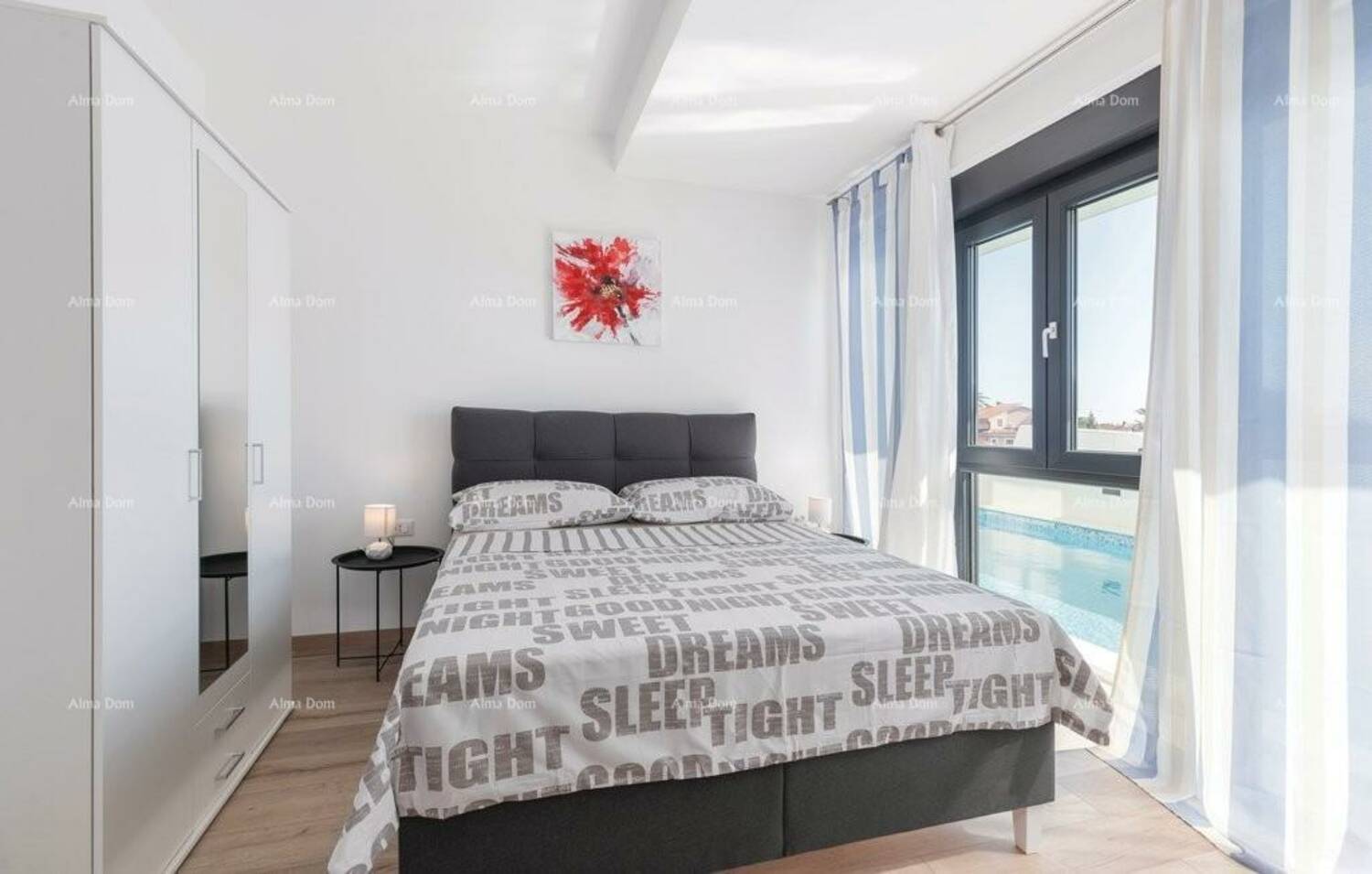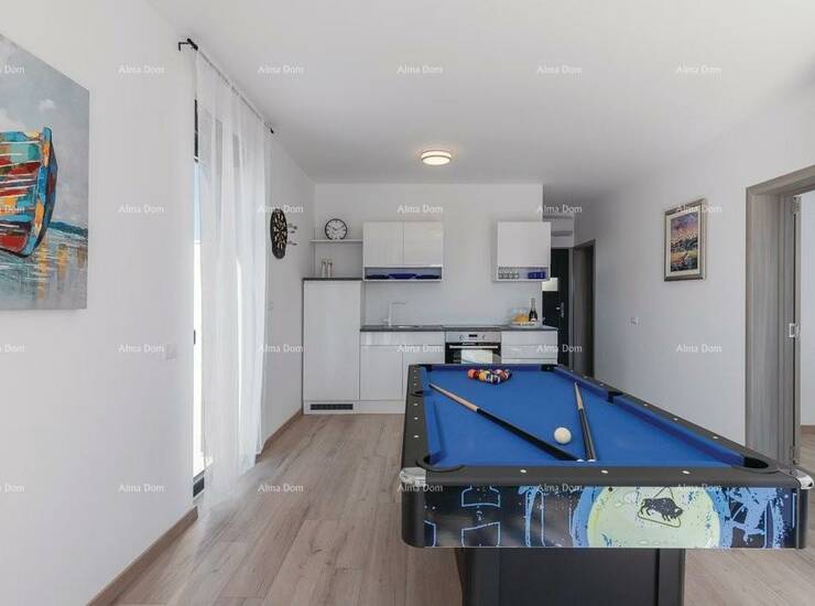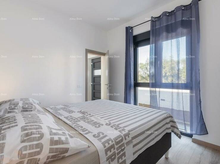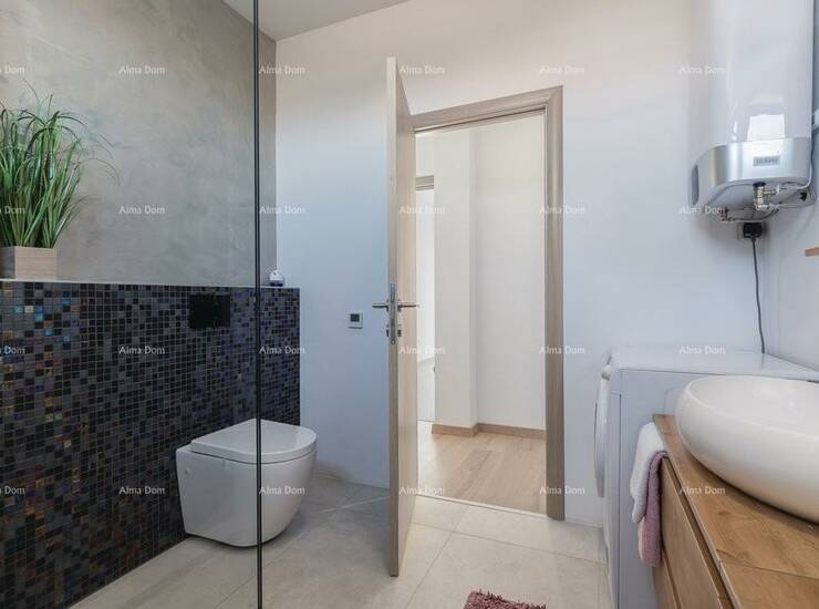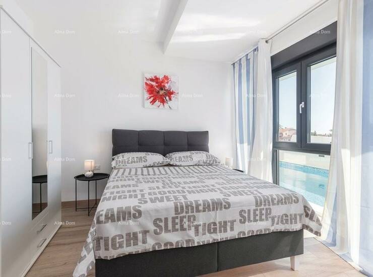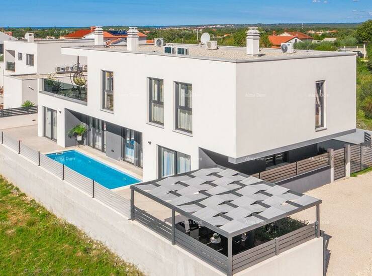 Nedaleko od Pule smještena je luksuzna vila na 2 .etaže. U prizemlju nalaze se 2 stana od 52 m2, sastoje se od 2 spavaće sobe svaka sa svojim kupatilom, kuhinja s blagovaonicom i dnevnim boravkom s kojeg se direktno izlazi na vanjsku terasu i bazen. Na gornjoj etaži nalazi se veliki stan od 104 m2 i terase, koji se sastoji od 3 spavaće sobe, 2 kupatila, kuhinja s blagavaonicom, dvevnim boravkom. Svi stanovi su opremljeni inverter klimom za grijanje i hlađenje. Ispred kuće nalazi se natkrivena terasa sa roštiljem, 4 parkirna mjesta.
