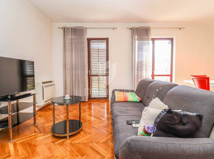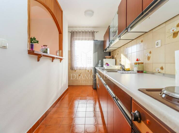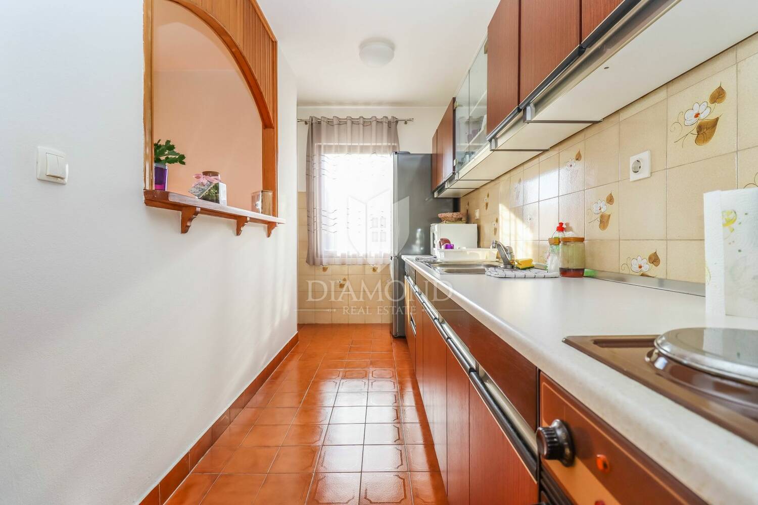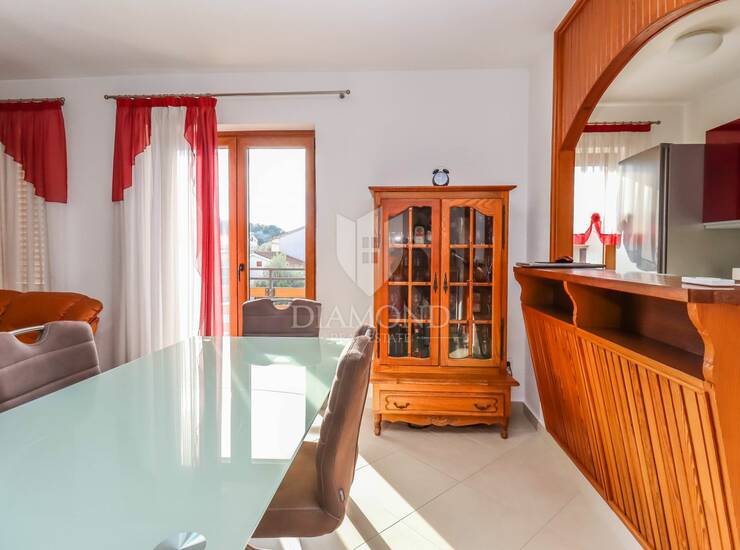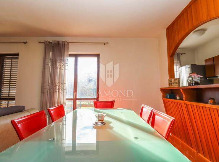 Stan u prizemlju se sastoji od hodnika, dvije spavaće sobe, kupaonice, odvojenog WC-a, kuhinje i blagovaonice te dnevnog boravka s izlazom na prostranu terasu koja vodi u lijepo uređeno dvorište. Stan na prvom kat obuhvaća hodnik, tri spavaće sobe, kupaonicu, kuhinju i blagovaonicu te dnevni boravak s izlazom na terasu. Uz kuću se nalaze i garaža, konoba i podrum, što dodatno povećava funkcionalnost prostora. Dvorište je prostrano i lijepo uređeno, idealno za opuštanje i boravak na otvorenom. Osim garaže, ispred kuće dostupno je i više vanjskih parkirnih mjesta.