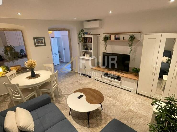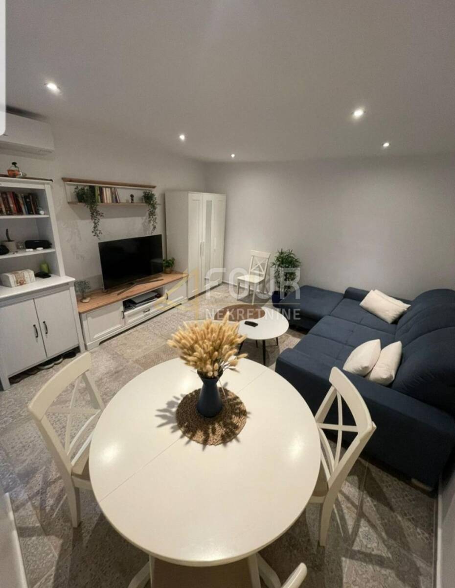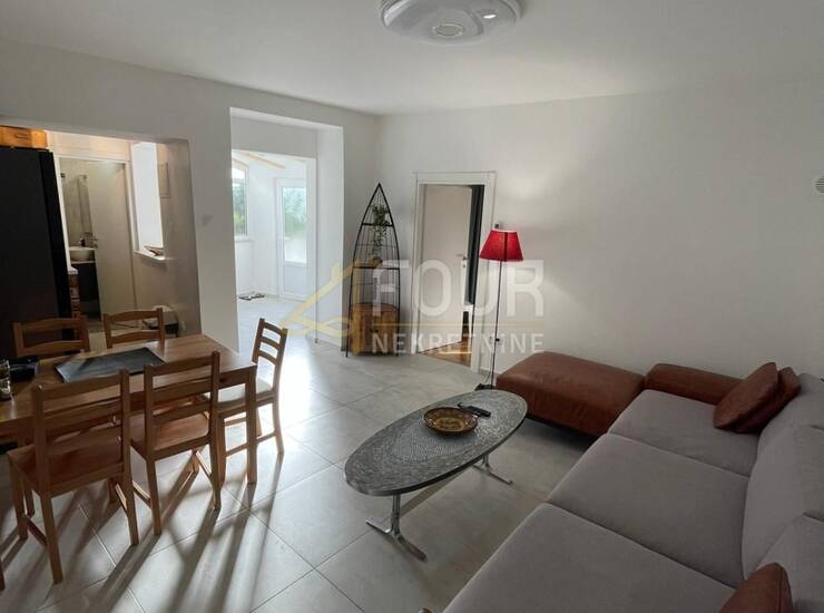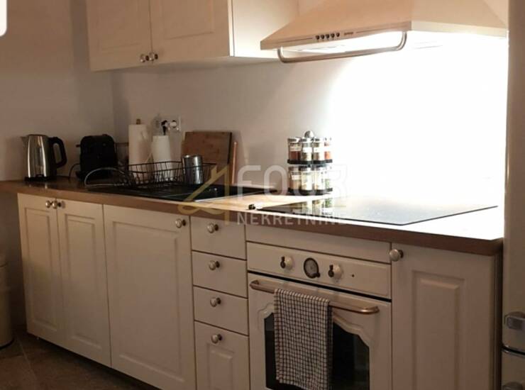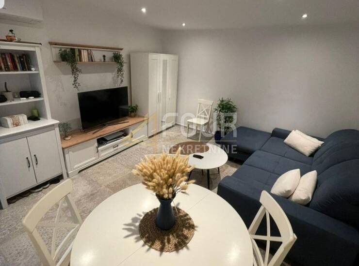 Kompletno je namješten i spreman za useljenje, a sastoji se od manjeg predsoblja, funkcionalne kuhinjice izrađene od punog hrasta, ugodnog dnevnog boravka s velikom kožnom kutnom garniturom te dvije spavaće sobe, pri čemu se do druge spavaće sobe prolazi kroz prvu.