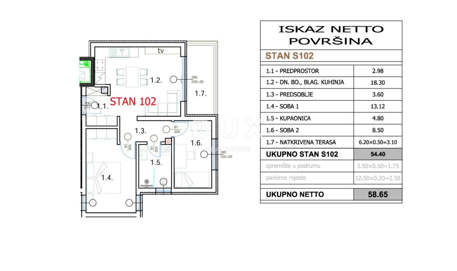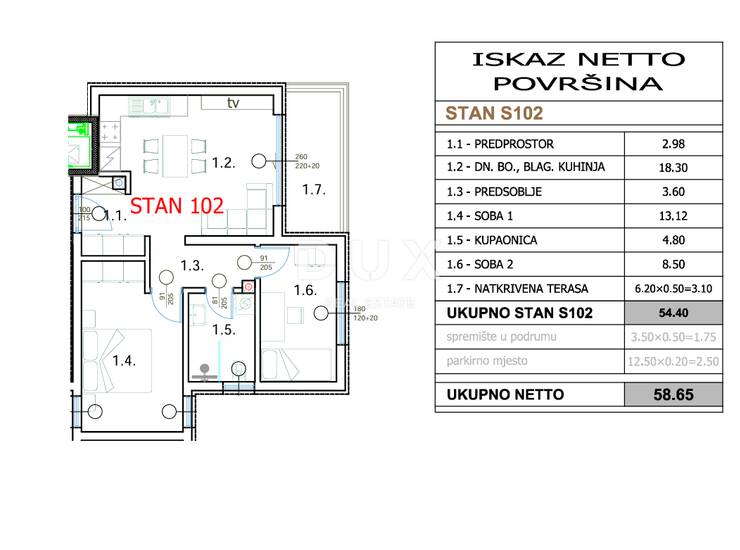 Nekretnini pripada i spremište u podrumu zgrade te vanjsko parkirno mjesto.