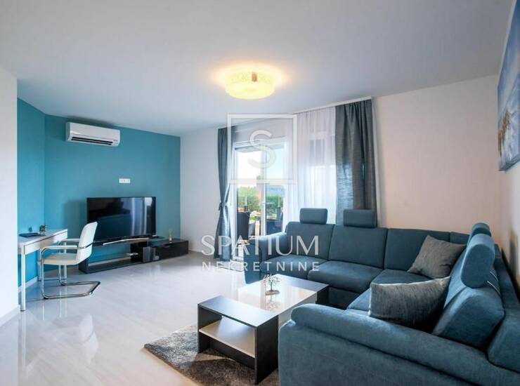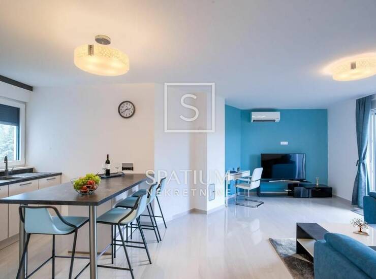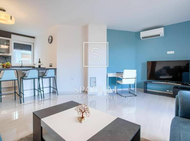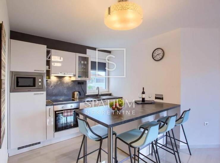 Sastoji se od jedne spavaće sobe, kupaonice, ostave s perilicom i sušilicom te otvorenog prostora koji povezuje kuhinju, blagovaonicu i dnevni boravak s izlazom na prostranu terasu – idealno mjesto za boravak tijekom toplih mjeseci. Dodatnu vrijednost daje i krovna terasa površine oko 50 m², pogodna za različite namjene.