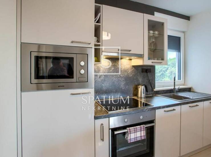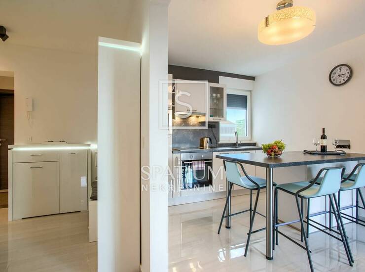 Prednost ove nekretnine je mirna, a opet vrlo praktična lokacija: centar grada udaljen je 500 m, a more svega 2 km. Stanu pripada jedno natkriveno parkirno mjesto u garaži.