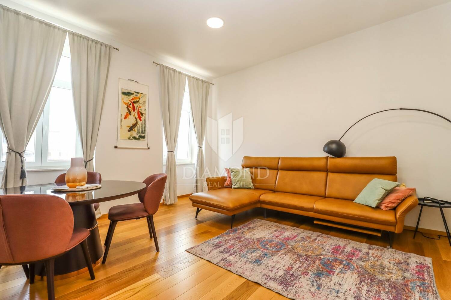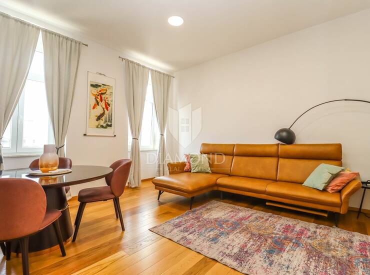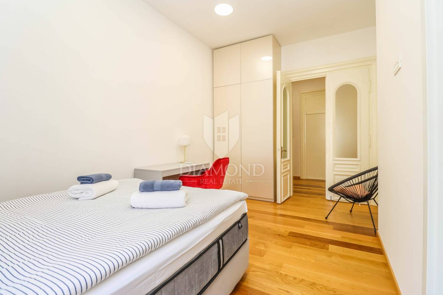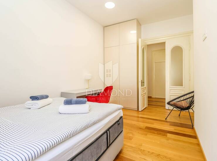 Stan površine 85 m² odiše elegancijom i prozračnošću zahvaljujući visokim stropovima i velikim francuskim prozorima s dekorativnim bordurama, koji prostoru daju poseban šarm. Potpuno je renoviran, opremljen i spreman za useljenje ili nastavak najma. Sastoji se od hodnika, prostranog dnevnog boravka povezanog s kuhinjom, ostave, dvije spavaće sobe, dvije kupaonice te balkona/terase, što ga čini izuzetno funkcionalnim i ugodnim za boravak. Stan se već uspješno iznajmljuje, što budućem vlasniku omogućuje odmah uhodan posao bez dodatnih ulaganja.