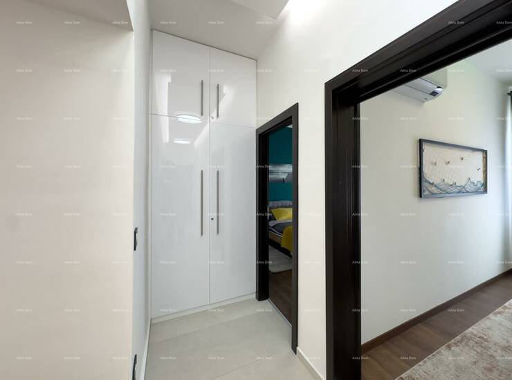 Raspored: dugački hodnik, kupatilo sa podnim grijanjem, blagovaonica, kuhinja, dnevni boravak , dvije spavaće sobe.