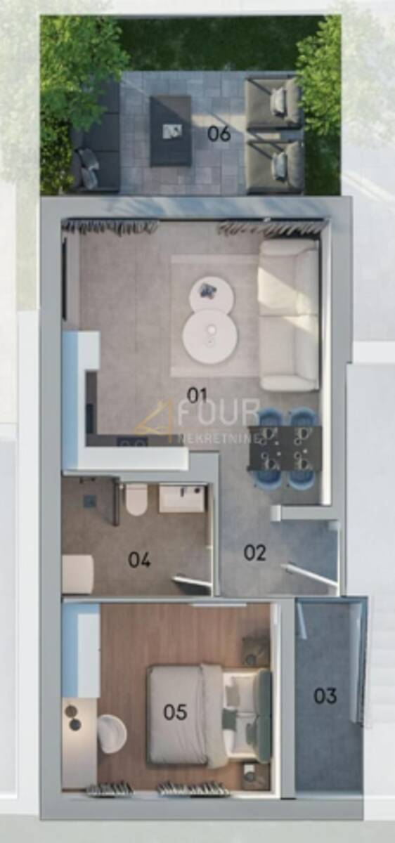 Smješten je u prizemlju manje stambene zgrade, ukupne površine 45,28 m2, a sastoji se od jedne spavaće sobe i dnevnog boravka s kuhinjom i blagovaonicom, uz dodatnu terasu površine 2,10 m2 koja pruža ugodan vanjski prostor za opuštanje.