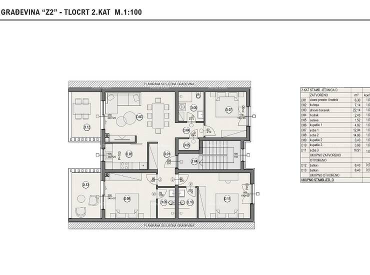 Stan D, površine 112,1 m2 ( neto površine 103,70 m2), nalazi se na 2. katu zgrade 2, a sastoji se od: ulaznog hodnika i hodnika, dnevnog boravka s blagovaonicom, kuhinje, trije spavaće sobe, tri kupaonice, ostave, te dva balkona.