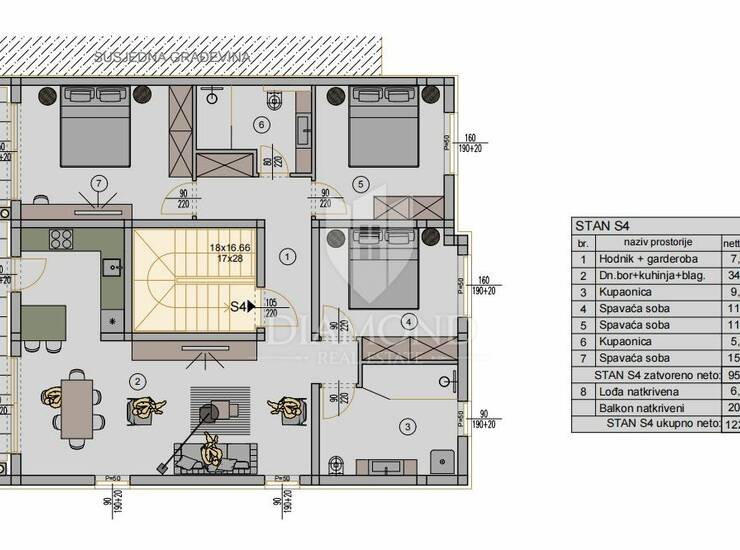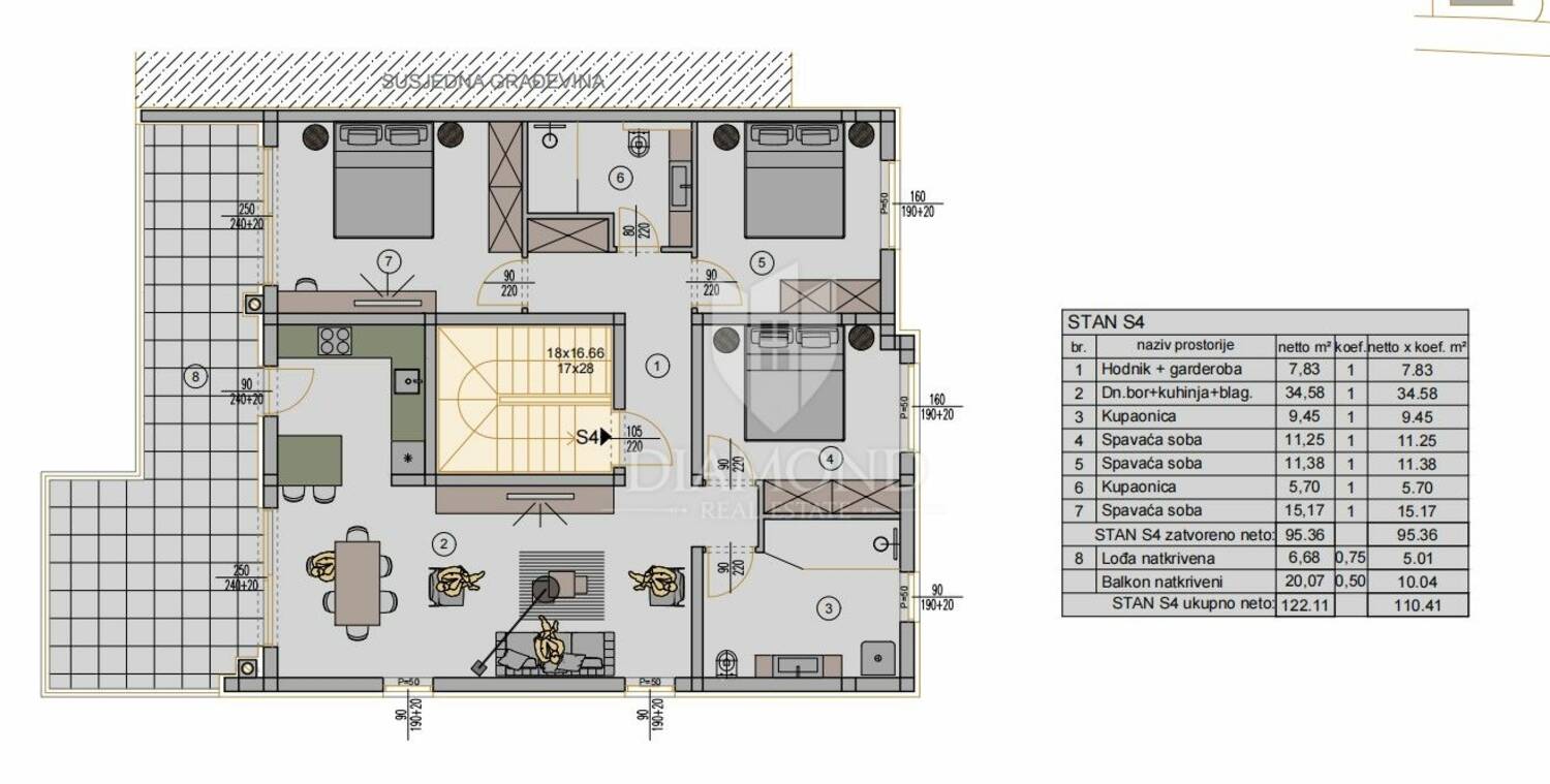 Na prodaju je stan na drugom katu ukupne površine 112 m2. Stan se sastoji od: tri spavaće sobe, dvije kupaonice, kuhinje s blagovaonicom i dnevnim boravkom s izlazom na prekrasnu terasu od 20 m2. Stan je opremljen: troslojnom PVC stolarijom s komarnicima i električnim roletama, podnim grijanjem u kupaonici, klimom za hlađenje i grijanje. Stanu pripadaju dva parkirna mjesta, koja se dodatno naplaćuju, a postoji i mogućnost kupnje i garažnog mjesta. U cijenu stana uračunata je ostava.