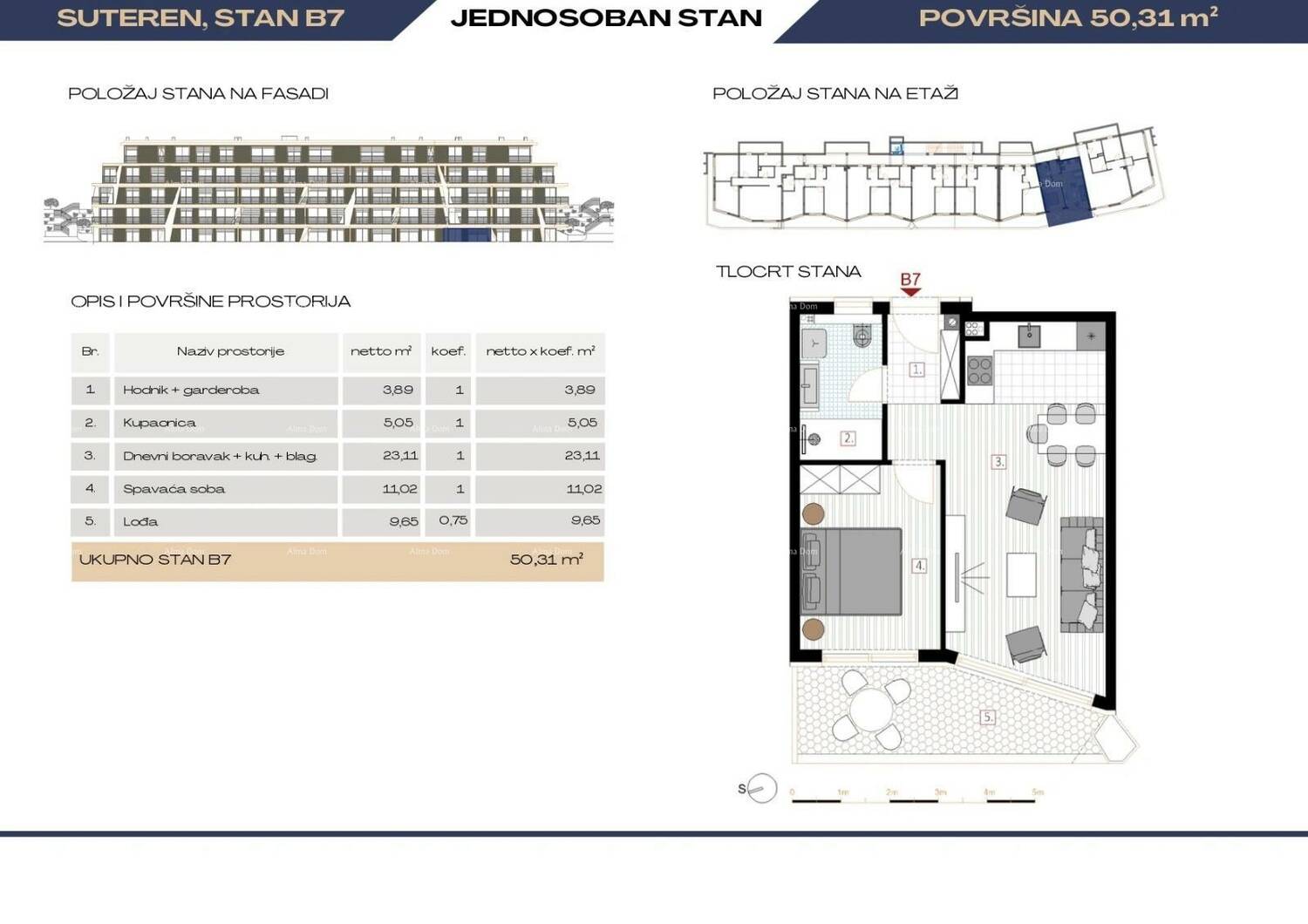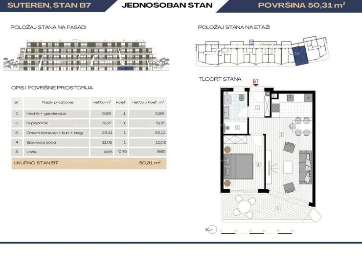 Stan B7, površine 54.36 m2(neto korisne površine 51.16m2), nalazi se u zgradi B.