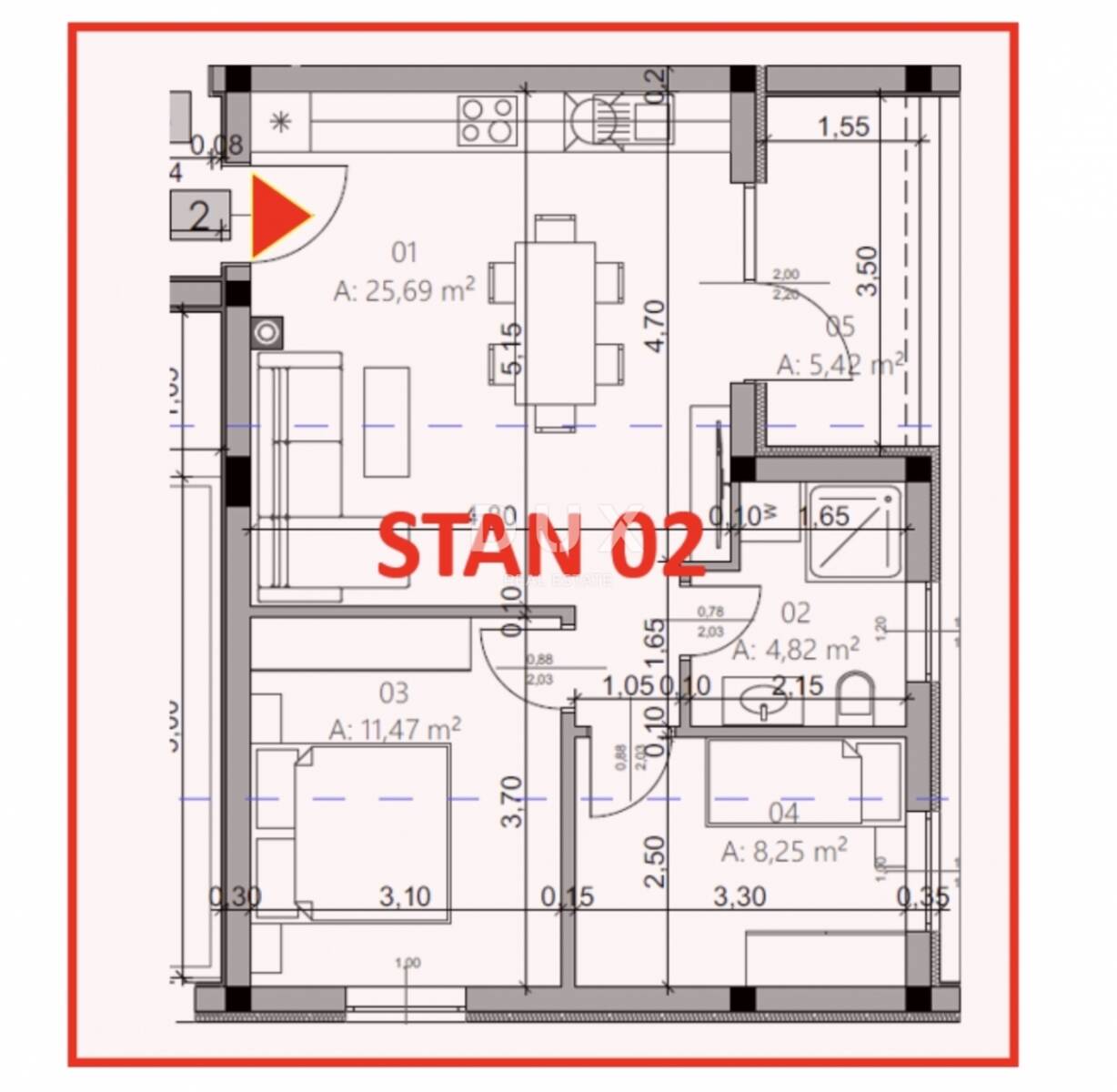 U ponudi imamo stan u prizemlju. Sastoji se od hodnika, kuhinje sa blagovaonicom i dnevnog boravka, dvije spavaće sobe, kupaonice i lođe.