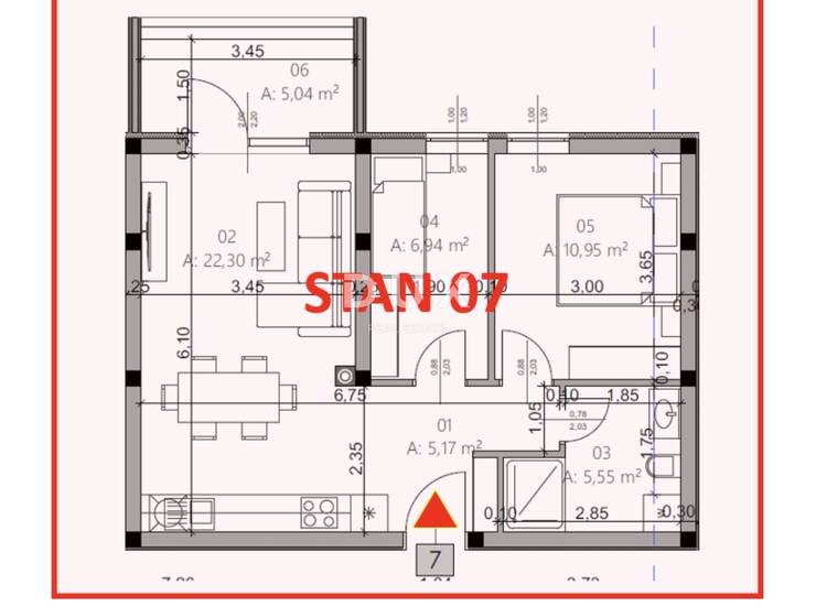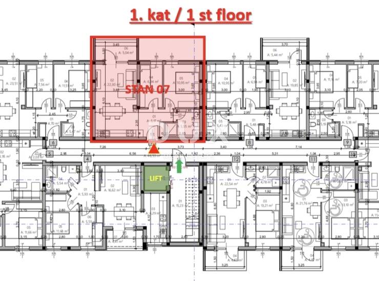 U ponudi imamo stan na prvom katu stambene zgrade. Sastoji se od ulaznog prostora, kuhinje sa blagovaonicom i dnevnog boravka, dvije spavaće sobe, kupaonice i lođe.