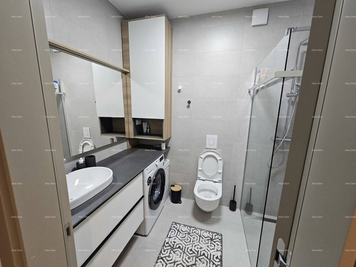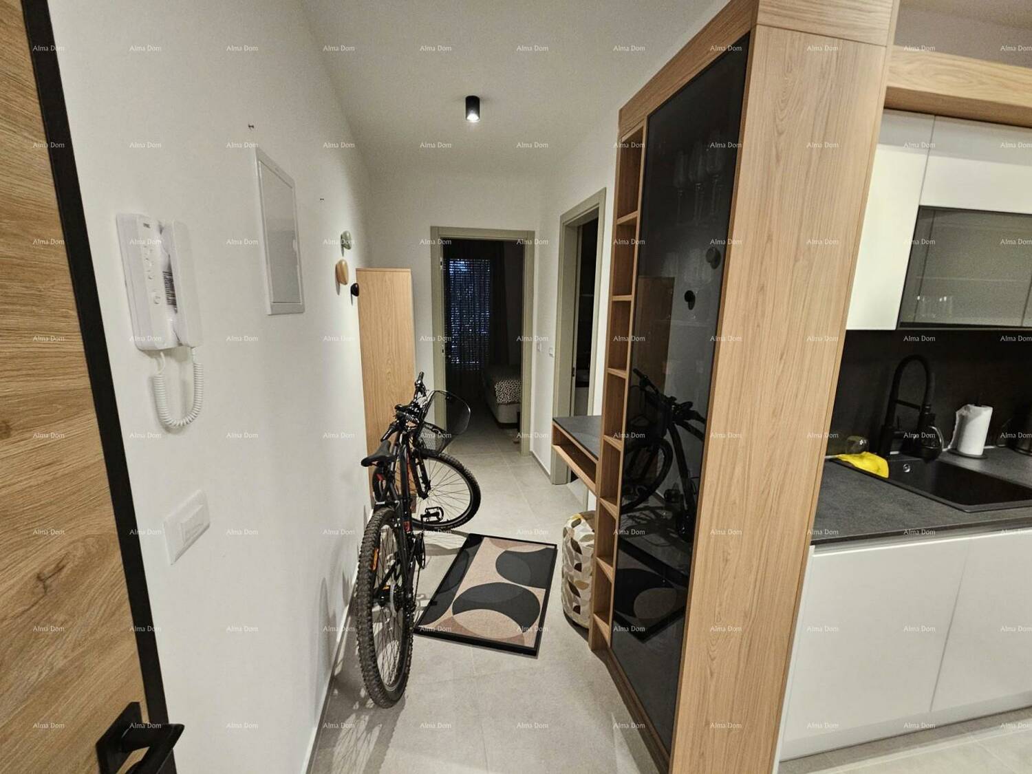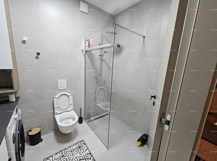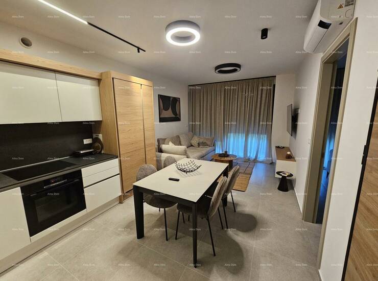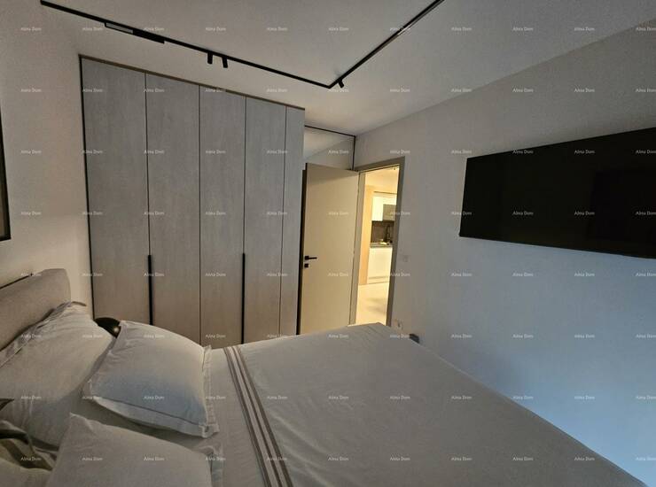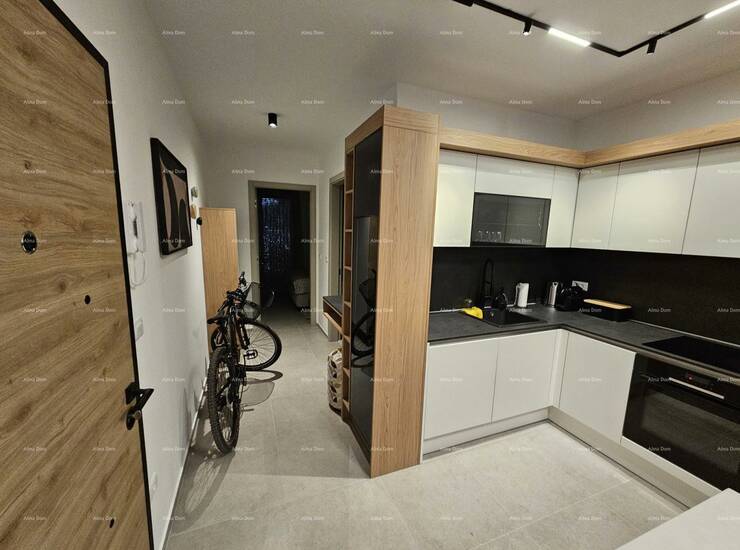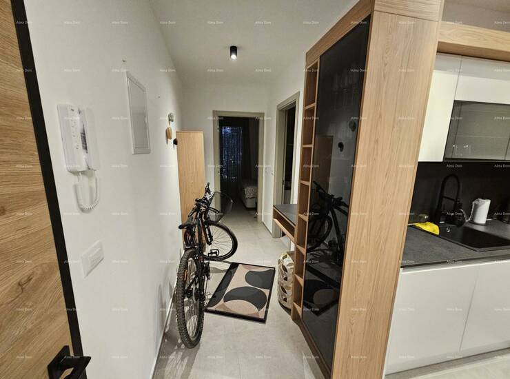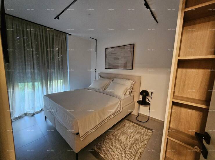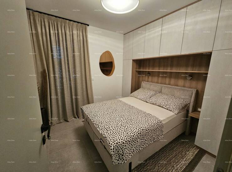 Stan je pažljivo uređen s namještajem rađenim po mjeri, uz brojne detalje koji osiguravaju maksimalnu udobnost i estetiku: ugradbeni ormari s rasvjetom, moderna kuhinja s kompletnom bijelom tehnikom, svi potrebni kućanski aparati te rasvjeta s daljinskim upravljanjem. Stan je odmah useljiv, bez ikakvog dodatnog ulaganja.