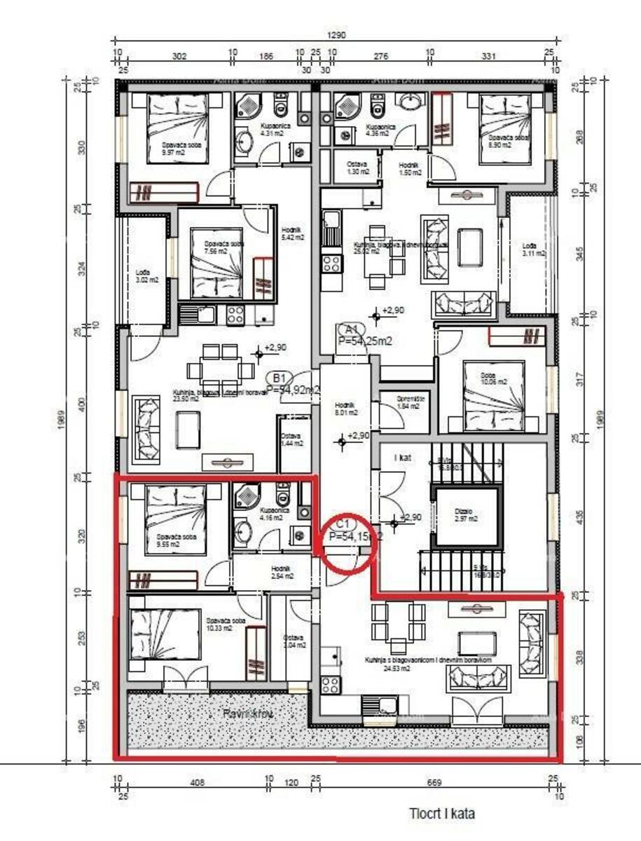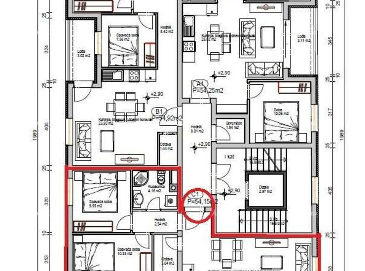 Stan C1 uključuje dnevni boravak sa kuhinjom i blagavaonom, 2. spavaće sobe, kupaonu, hodnik i ostavu.