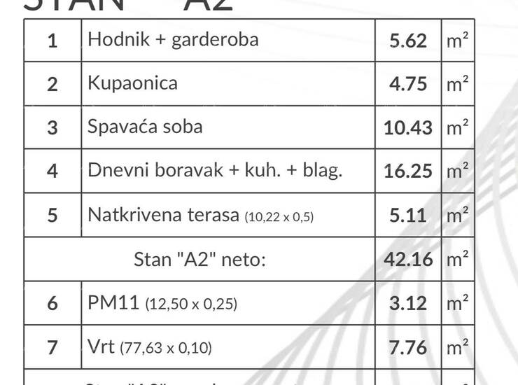 Stan A2, nalazi se u prizemlju zgrade i sastoji se od: hodnik+garderoba, dnevni boravak sa kuhinjom i blagovaonicom, spavaće sobe, kupatila i natkrivene terase. Stanu pripada jedno parkirno mjesto od 3,12 m2 i vrt od 77.63 m2.