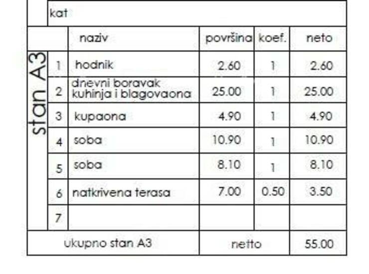 Stan A3, površine 55 m2, nalazi se na 1 katu zgrade te sastoji se od: