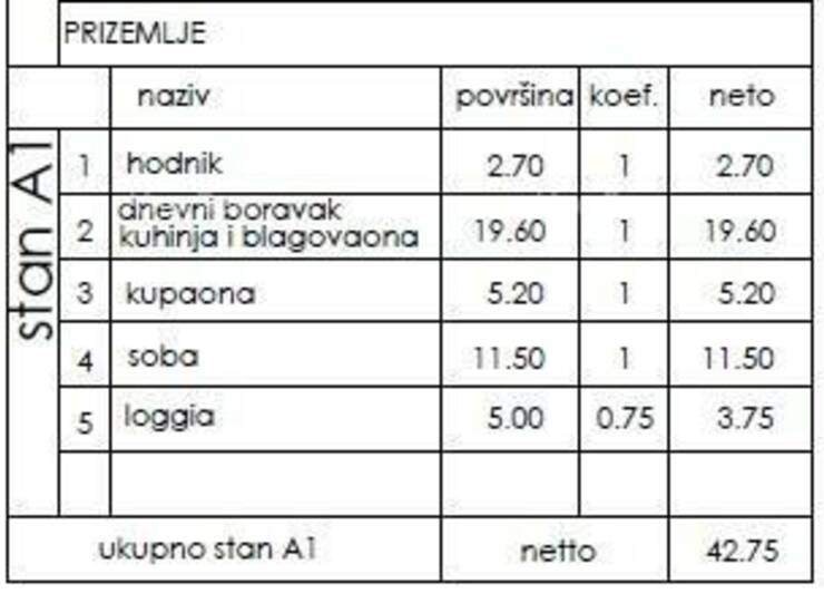 Stan A1, površine 42,75 m2, nalazi se u prizemlju zgrade te sastoji se od: