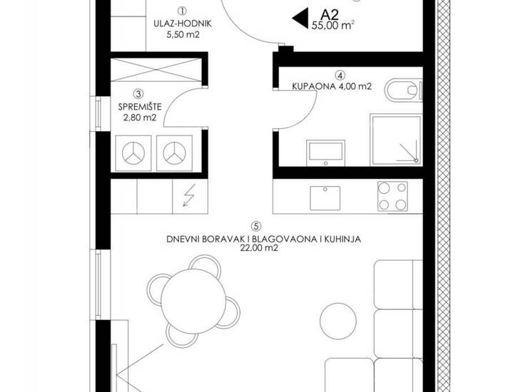 Stan A2 nalazi se na 1 katu zgrade i sastoji se od hodnika, kupaonice, 2 spavaće sobe, spremišta te kuhinje s blagovaonicom i dnevnim boravkom koji imaju izlaz na terasu.