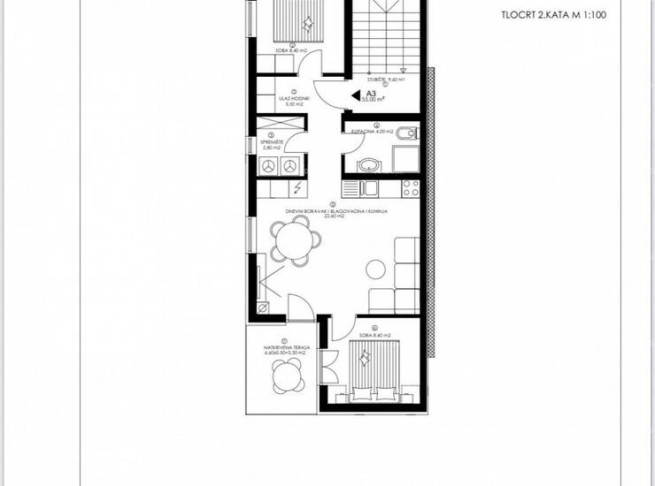 Stan A3 nalazi se na 2 katu zgrade i sastoji se od hodnika, kupaonice, 2 spavaće sobe, spremišta te kuhinje s blagovaonicom i dnevnim boravkom koji imaju izlaz na terasu.