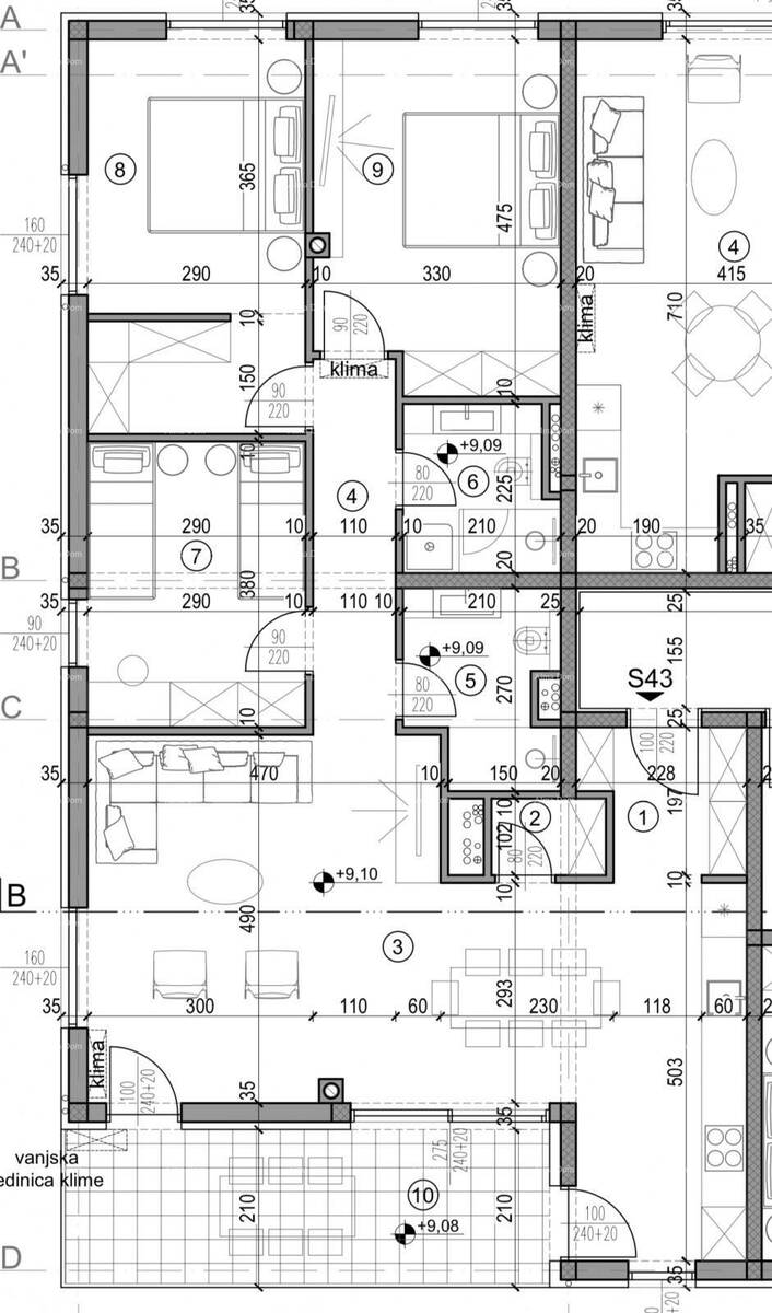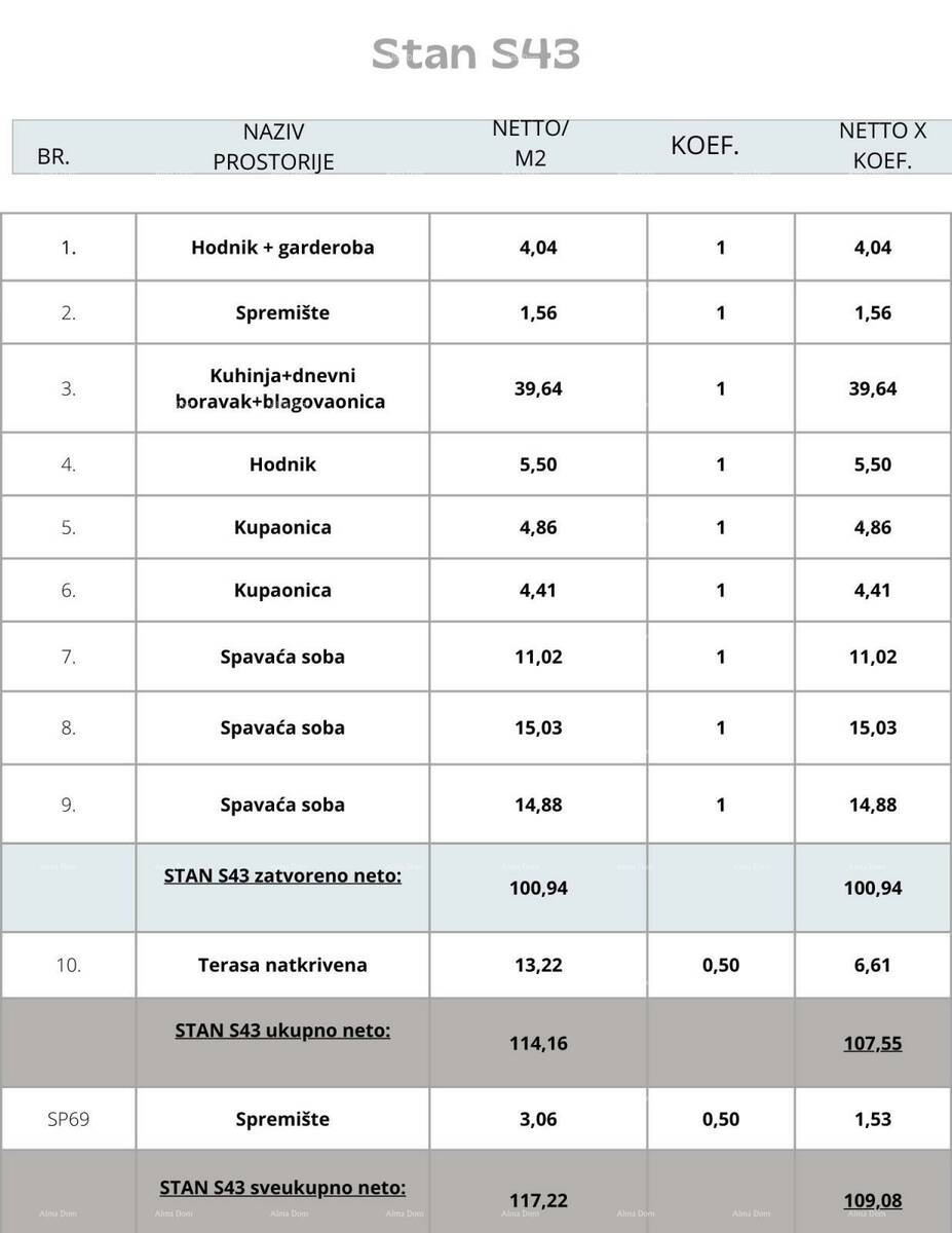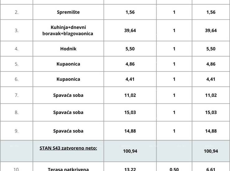 Stan se sastoji od ulaznog hodnika sa garderobom, spremišta, 3 spavaće sobe, 2 kupaonice, kuhinje s blagavaonom, dnevnim boravkom i natkrivene terase.