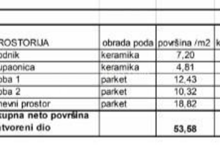 Stan se sastoji od honika, dnevnog boravka sa kuhinjom i blagavaonom, 2 spavaće sobe, 1 kupaone.