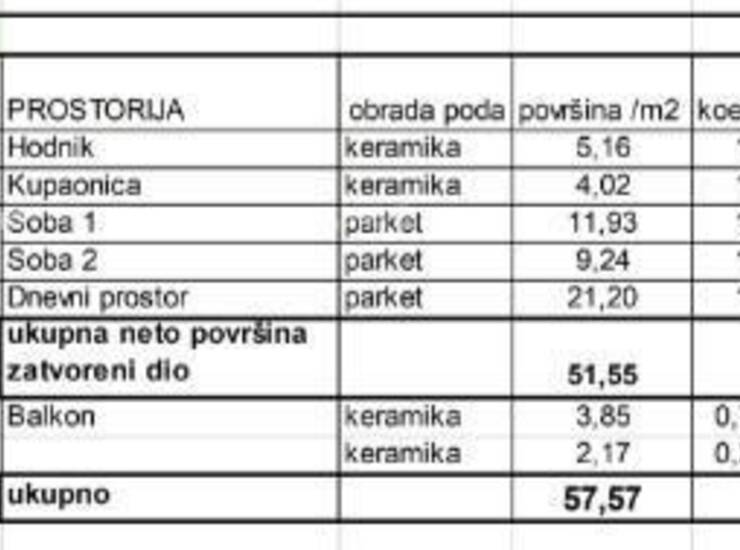 Stan se sastoji od honika, dnevnog boravka sa kuhinjom i blagavaonom, 2 spavaće sobe, kupaone i balkona.