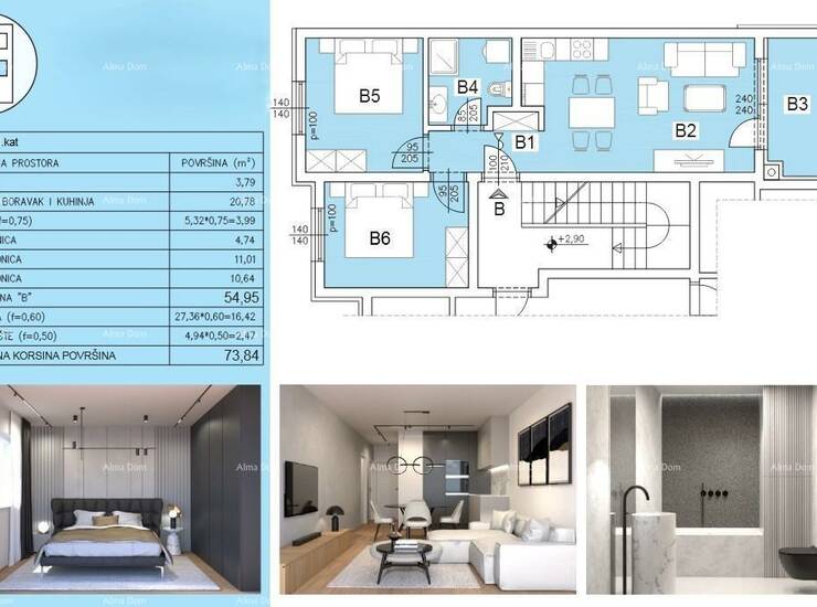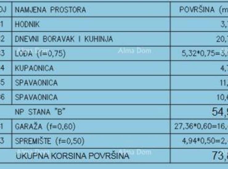 Stambeni prostor od 54,95 m² sastoji se od dnevnog boravka s kuhinjom i blagovaonicom, dvije spavaće sobe, kupaonice, hodnika i lođe koja pruža ugodan prostor za opuštanje.