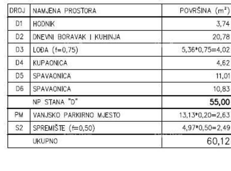 Stambeni prostor od 55 m² sastoji se od dnevnog boravka s kuhinjom i blagovaonicom, dvije spavaće sobe, kupaonice, hodnika i lođe koja pruža ugodan prostor za opuštanje.