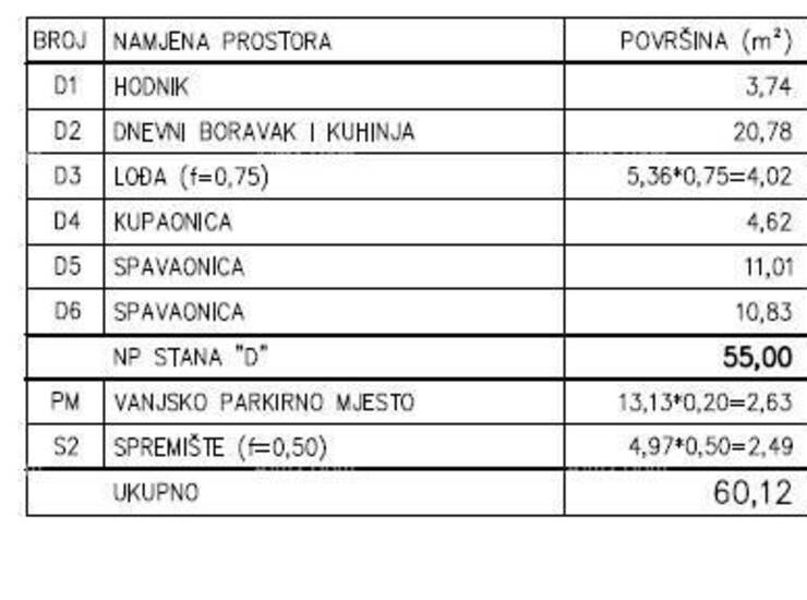 Stambeni prostor od 55 m² sastoji se od dnevnog boravka s kuhinjom i blagovaonicom, dvije spavaće sobe, kupaonice, hodnika i lođe koja pruža ugodan prostor za opuštanje.