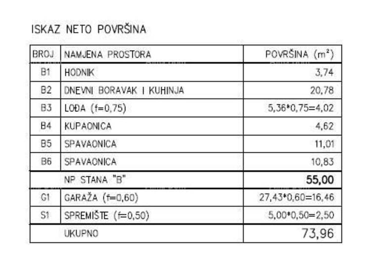 Stambeni prostor od 55 m² sastoji se od dnevnog boravka s kuhinjom i blagovaonicom, dvije spavaće sobe, kupaonice, hodnika i lođe koja pruža ugodan prostor za opuštanje.
