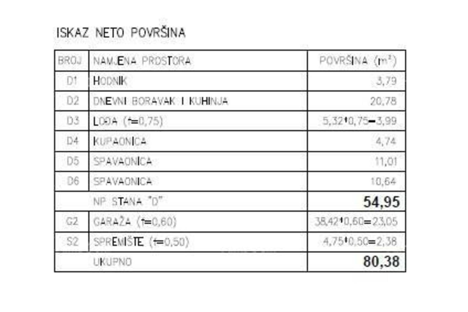 Stan F-D nalazi se na drugom katu zgrade F i obuhvaća ukupnu površinu od 80,38 m², uključujući stambeni dio, lođu, garažno parkirno mjesto i spremište.