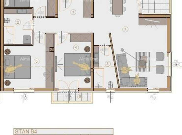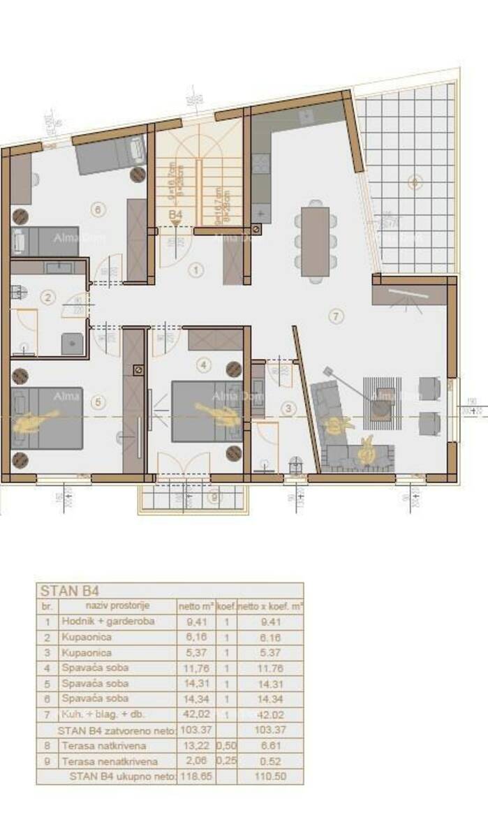 Stan B4, površine 118,65m2 (neto površine od 110.50m2) će se nalaziti na drugom katu i sastojati će se od kuhinje sa dnevnim boravkom i blagavaonom, 3 spavaće sobe, 2 kupaone i 2 terase.
