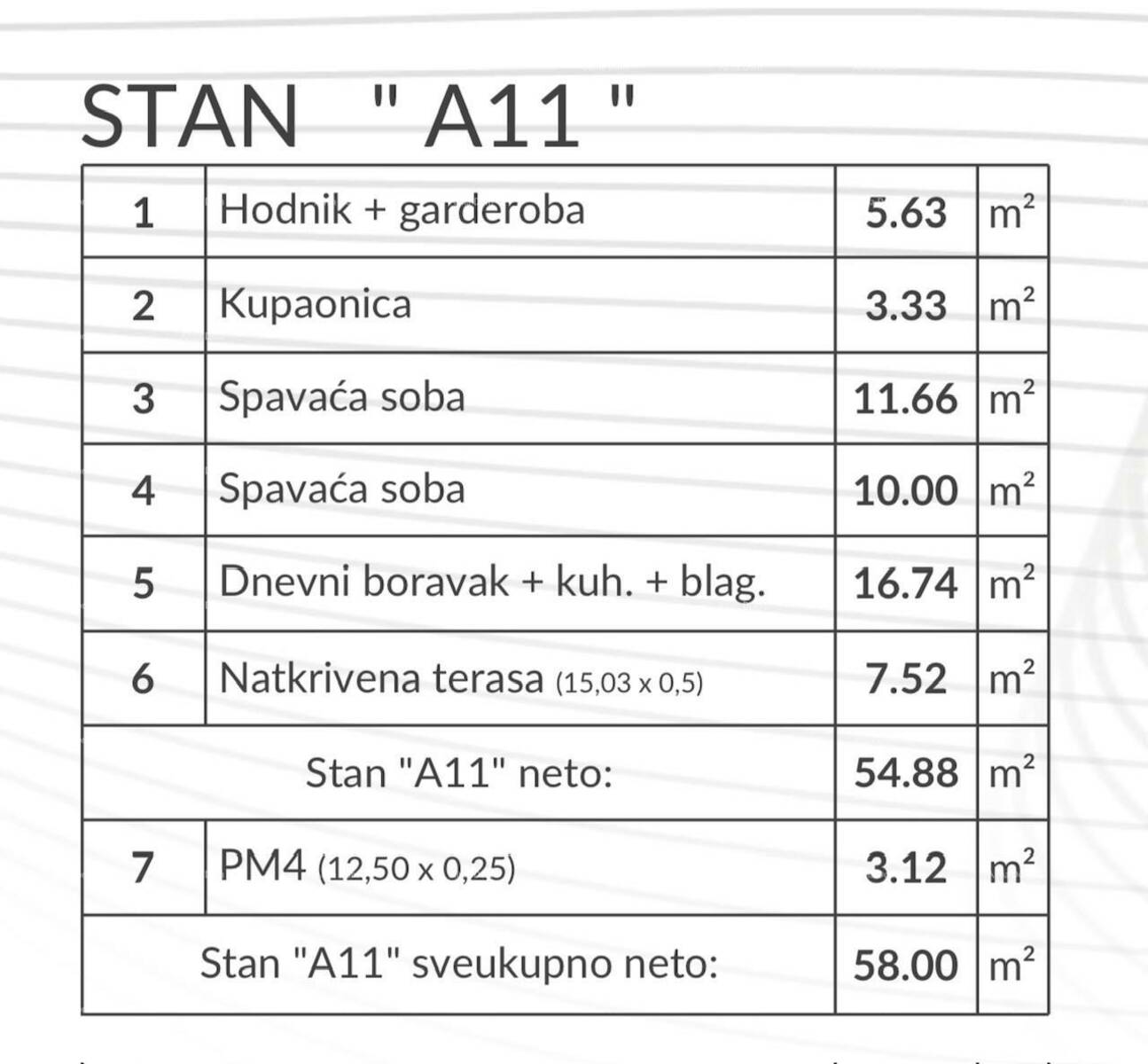 Stan A11, nalazi se na 2.katu zgrade i sastoji se od: hodnik+garderoba, dnevni boravak sa kuhinjom i blagovaonicom, 2 spavaće sobe, kupaonice i natkrivene terase. Stanu pripada jedno parkirno mjesto PM4 od 3,12 m2.