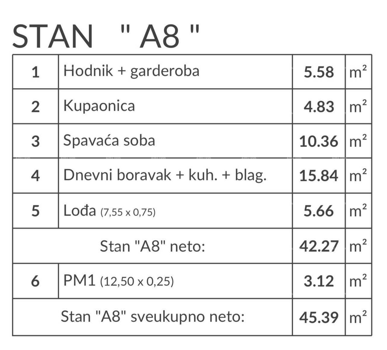 Stan A8, nalazi se na 1.katu zgrade i sastoji se od: hodnik+garderoba, dnevni boravak sa kuhinjom i blagovaonicom, 1 spavaće sobe, kupaonice i loggia-e. Stanu pripada jedno parkirno mjesto PM1 od 3,12 m2.
