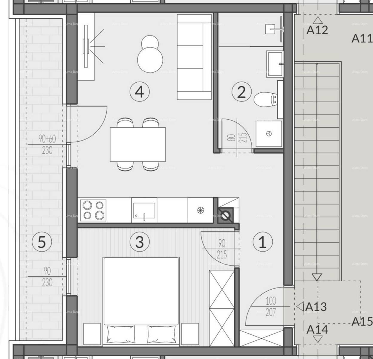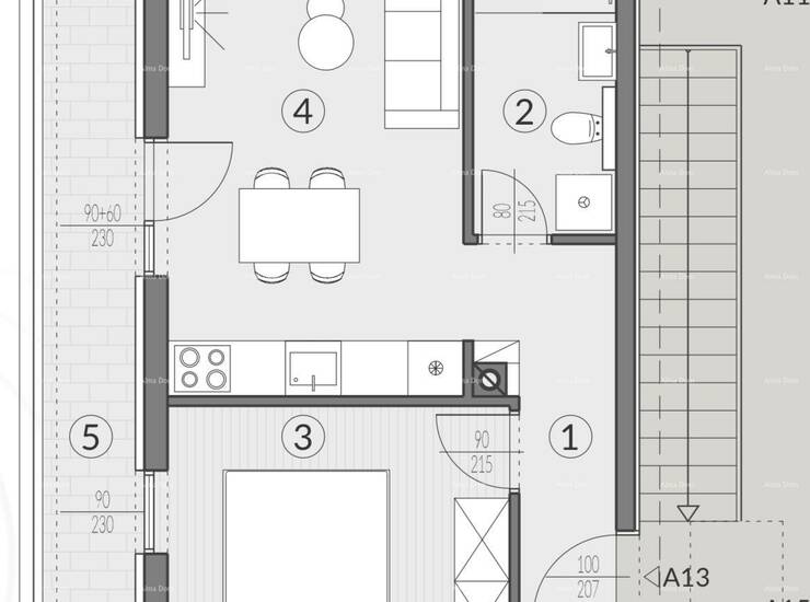 Stan A13, nalazi se na 2.katu zgrade i sastoji se od: hodnik+garderoba, dnevni boravak sa kuhinjom i blagovaonicom, 1 spavaće sobe, kupaonice i lođe. Stanu pripada jedno parkirno mjesto PM6 od 3,12 m2.