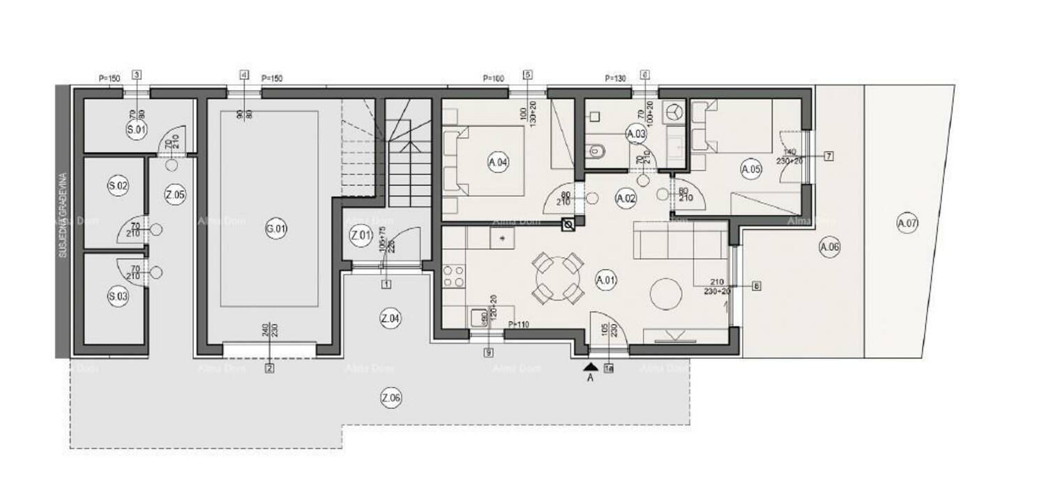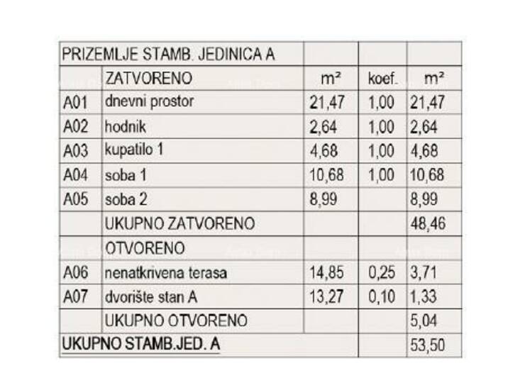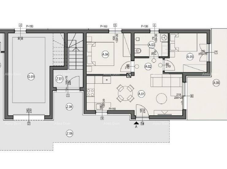 Stan A, nalazi se u prizemlju zgrade A3 i sastoji od: dnevnog prostora s kuhinjom i blagavaonom, 2 spavaće sobe, kupaone, hodnika, nenatkrivene terase i dvorišta.