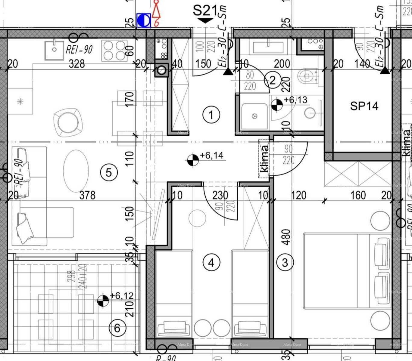 U ponudi je stan na 1. katu višestambene zgrade s liftom. Stan S21 će se sastojati od ulaznog hodnika+garderoba, 2 spavaće sobe, kupaonice, kuhinje s blagavaonom te dnevnim boravkom i loggia.