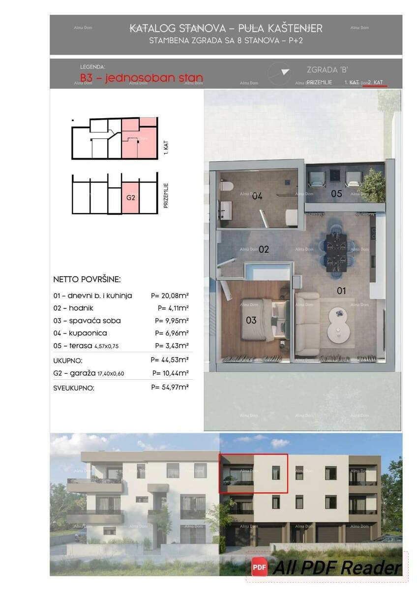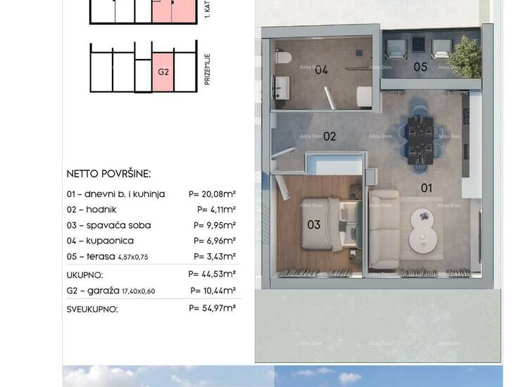 Površina od 55 m² obuhvaća spavaću sobu, dnevni boravak s kuhinjom i blagavaonicom te terasom, pružajući optimalan raspored za udoban život.