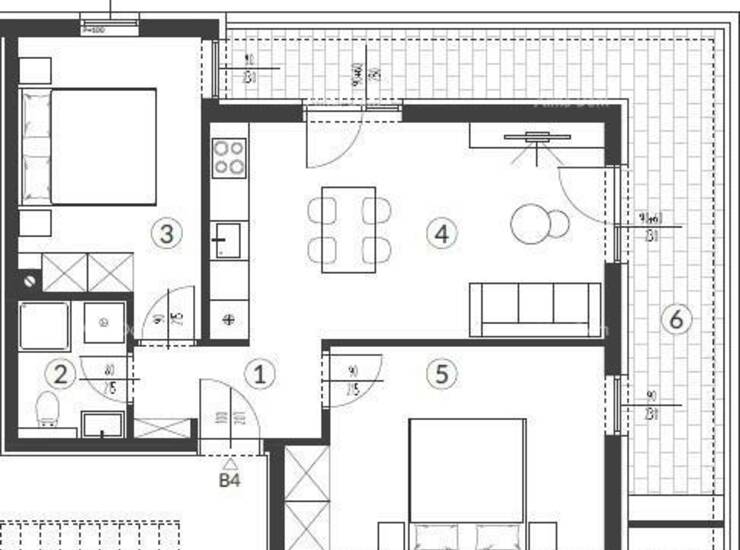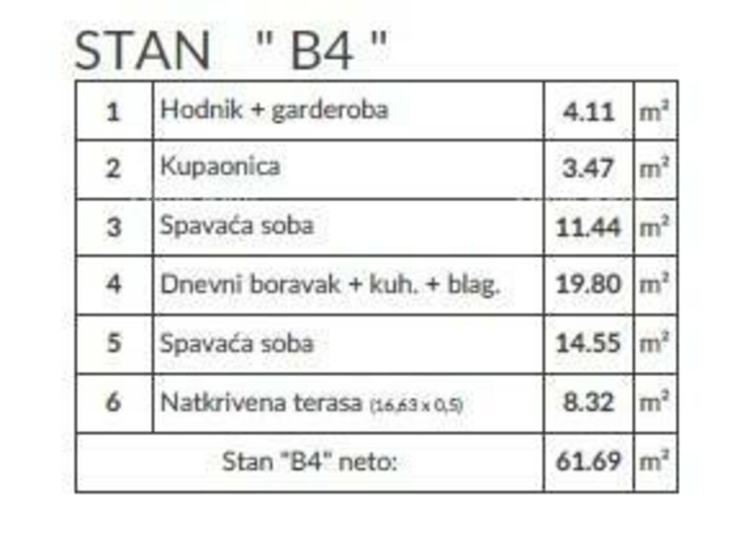 Stan B4, površine 61.69 m2, nalazi se u prizemlju zgrade i sastoji se od: hodnik+garderoba, dnevni boravak sa kuhinjom i blagovaonicom, 2 spavaće sobe, kupatila i natkrivene terase.
