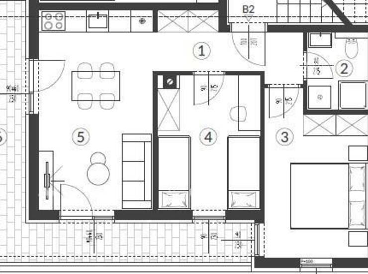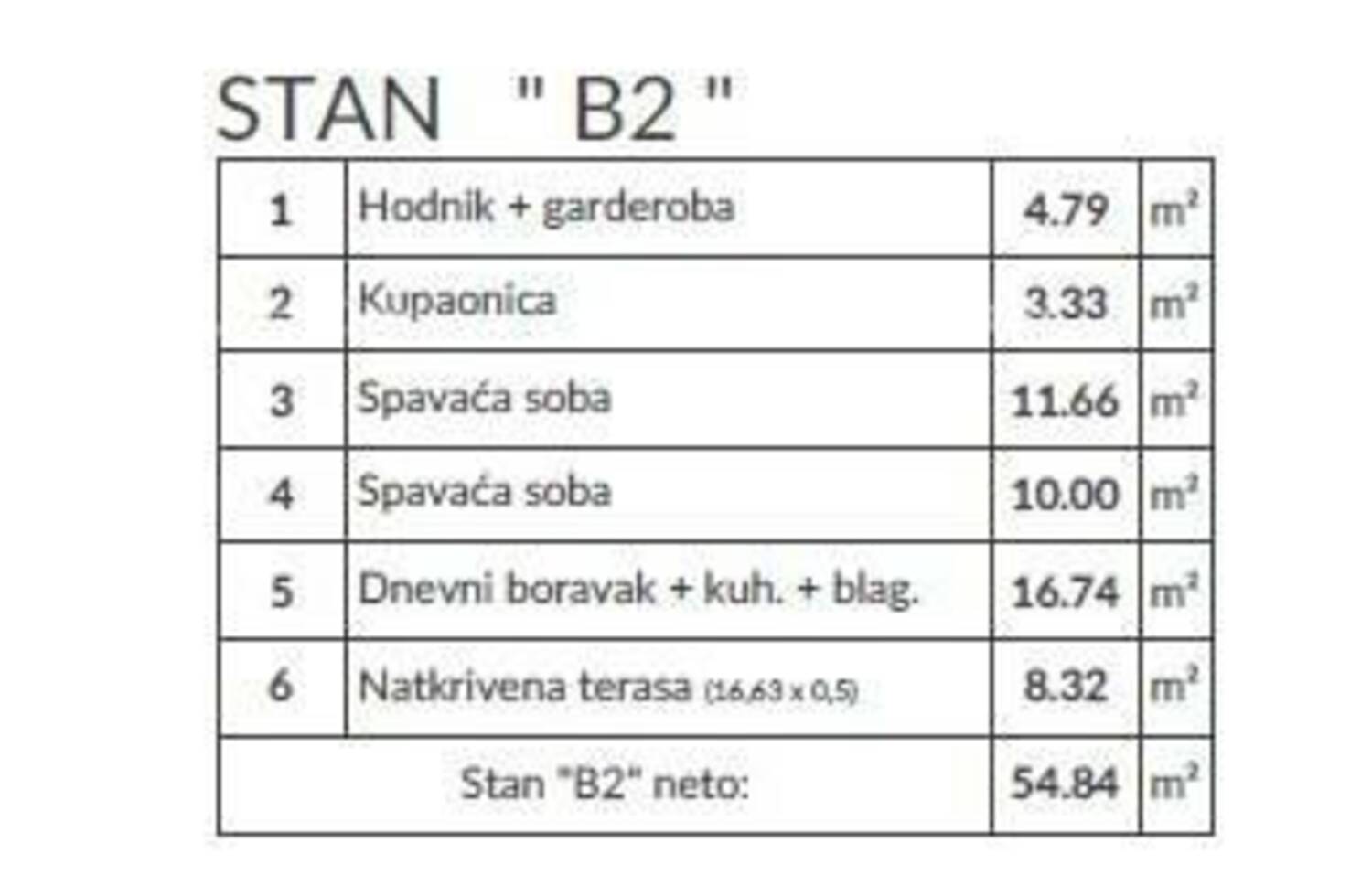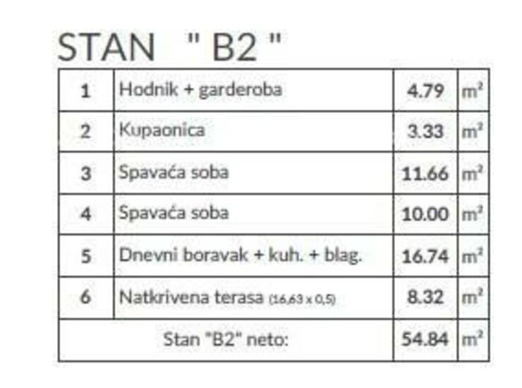 Stan B2, površine 54.84 m2, nalazi se u prizemlju zgrade i sastoji se od: hodnik+garderoba, dnevni boravak sa kuhinjom i blagovaonicom, 2 spavaće sobe, kupatila i natkrivene terase.