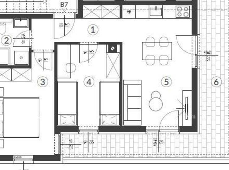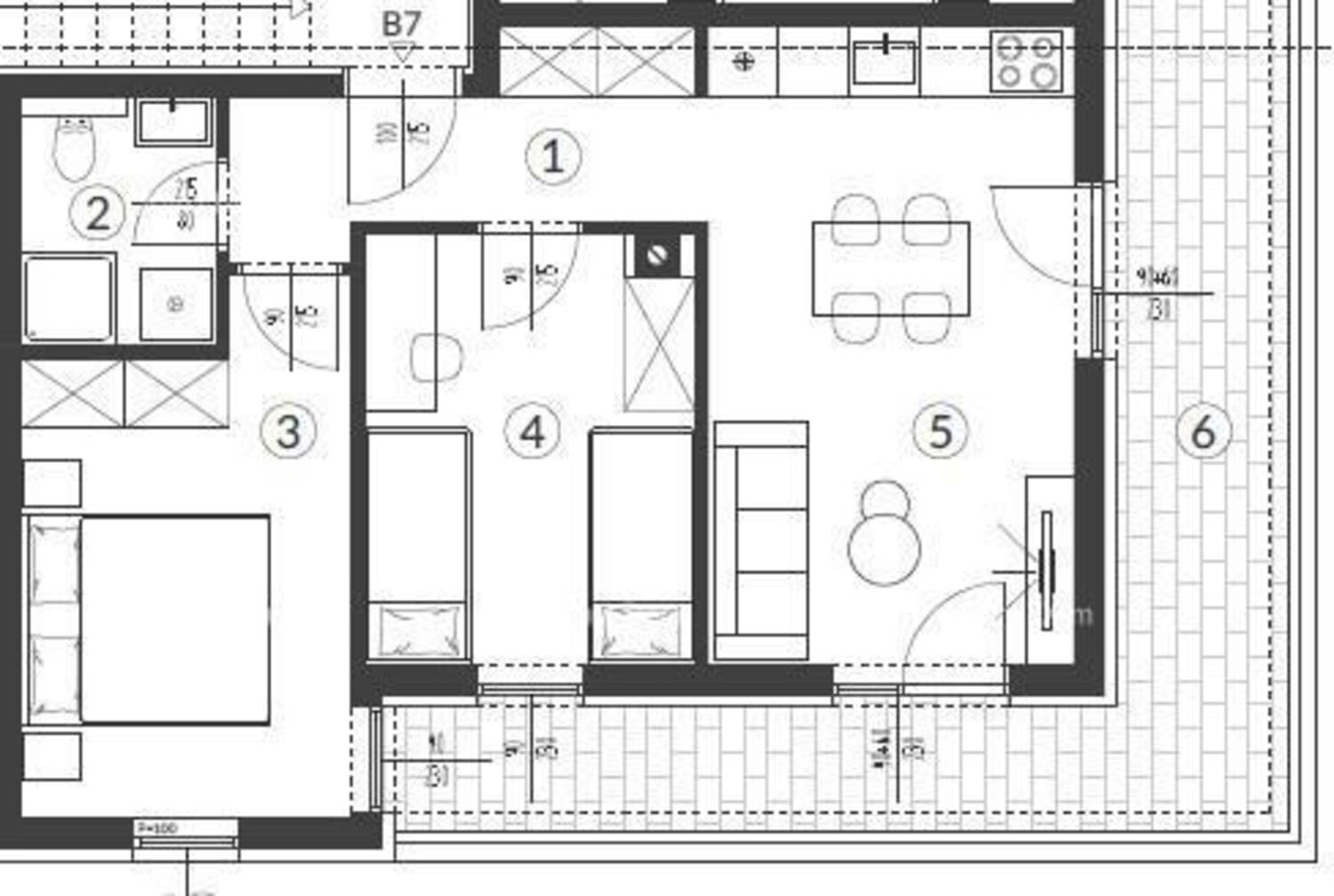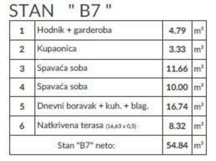Stan B7, površine 54.84 m2, nalazi se na 1 katu zgrade i sastoji se od: hodnik+garderoba, dnevni boravak sa kuhinjom i blagovaonicom, 2 spavaće sobe, kupatila i natkrivene terase.
